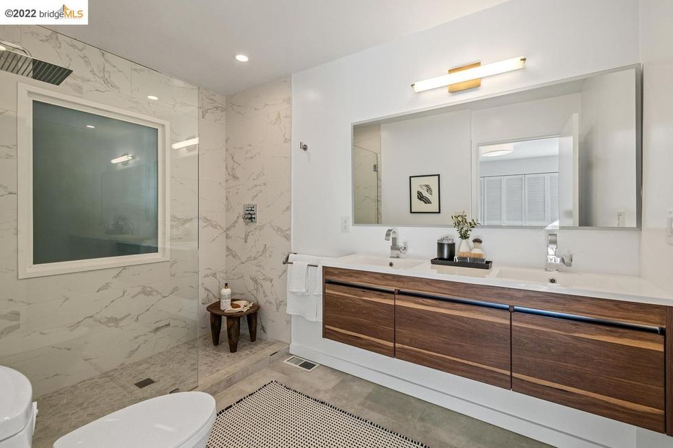 There are lush views through the windows in each of the bedrooms. While the master suite isn't particularly large, it does include perks like access to the deck and a nice bathroom with a marble walk-in shower and a dual sink floating vanity.