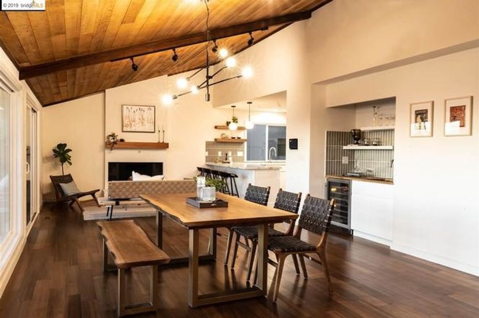With exterior slatwall paneling and and a slanted roof, the subtly ranch-style home has been thoughtfully renovated. You'll enter into a flowing floor plan where living and dining areas are fully open to one another and flanked by two fireplaces; the space is backed by an entire wall of windows that allow in views of the 30-foot deck and beyond.