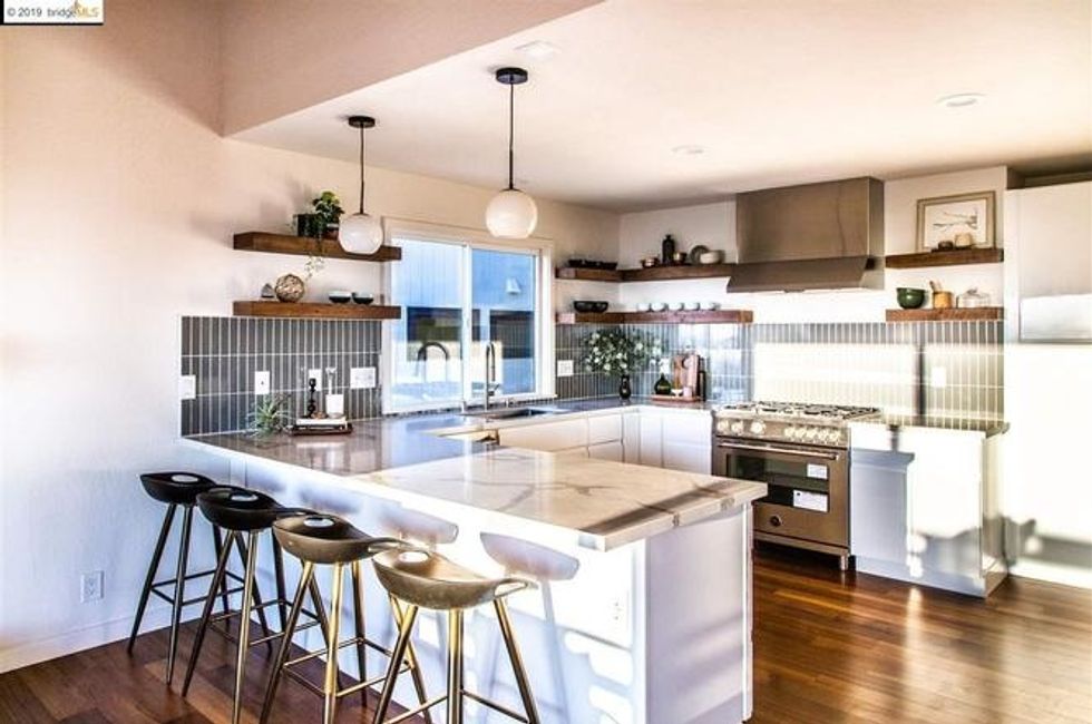 Opposite the windows is a small, semi-open kitchen marble countertops, a subway tile backsplash, floating wood shelves, and twin pendant lights. A stylish wet bar, faultlessly placed alongside the dining area for easy access, signals good times to come.