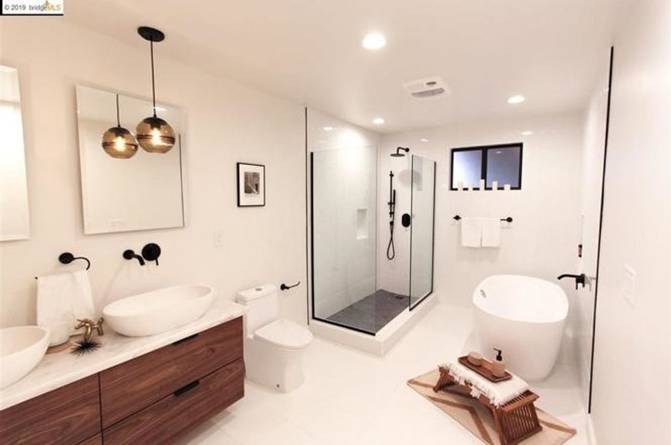 There are four bedrooms here including the master suite which sits on street level and has creature comforts including a walk-in closet and private patio. The master bath has dual sinks, a rainfall shower, and free-standing tub. An adjacent flex room can be a quiet space for an office, with access to a small street-facing deck for breezy breaks.