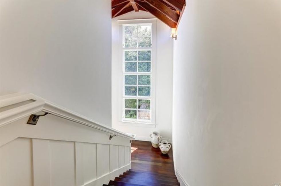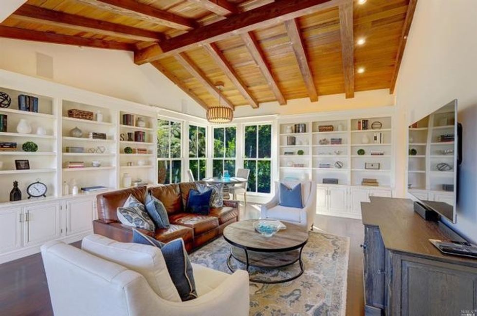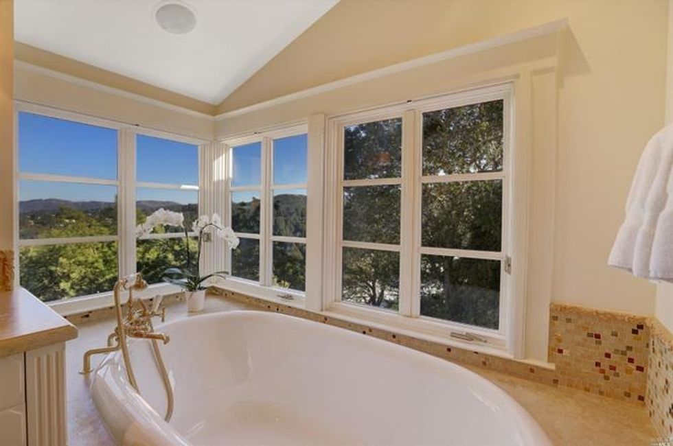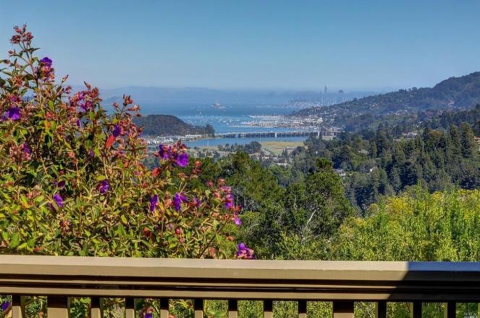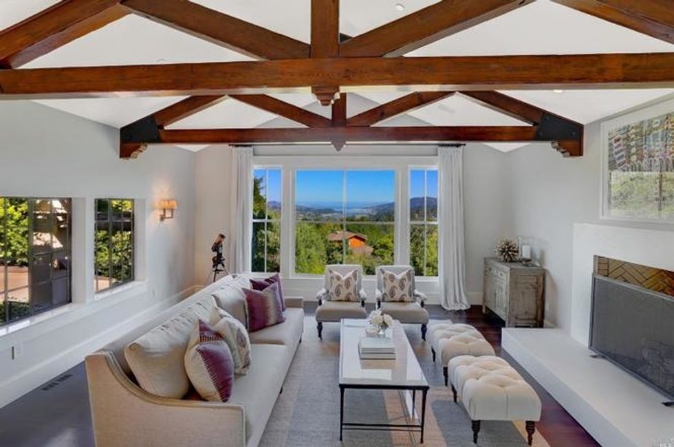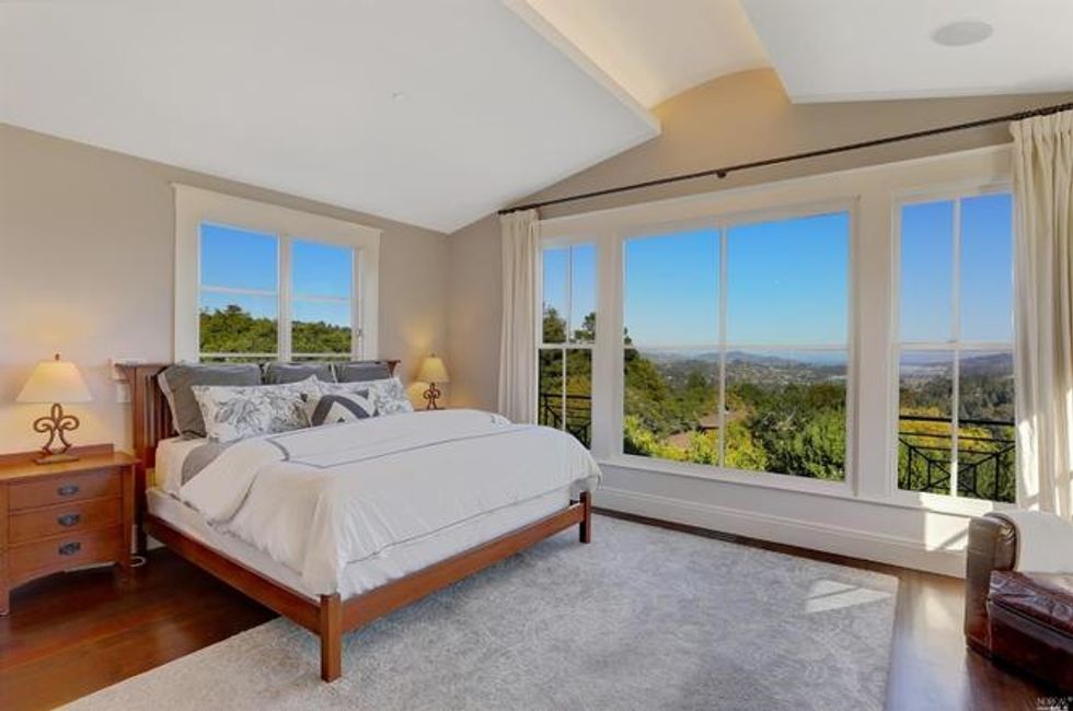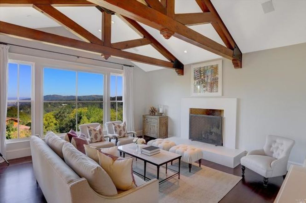 On the main level, the living room has all the hygge vibes with open beams, picture windows, and a large fireplace. The bright kitchen has Calacatta marble, designer stonework, and an adjacent dining room. After dinner, chill in the family room under a beautiful, arched wood ceiling and grab a book from the built-in shelving. Also on this level is the master suite with lush treetop views looking out to the water and San Francisco; the master bathroom has an oversized shower and soaking tub with its own set of beautiful panoramas.