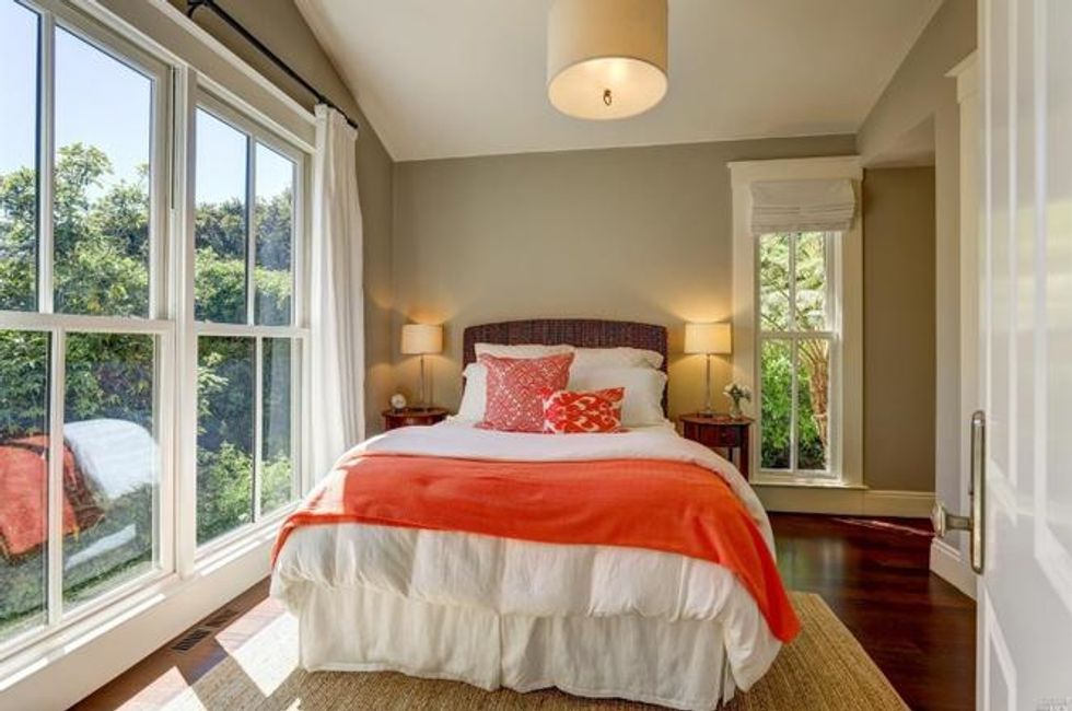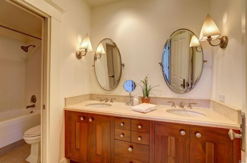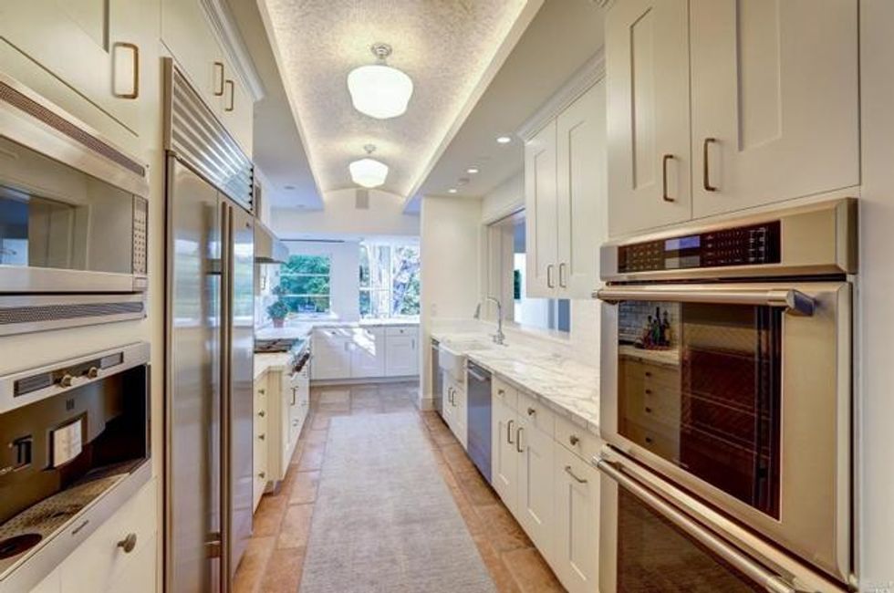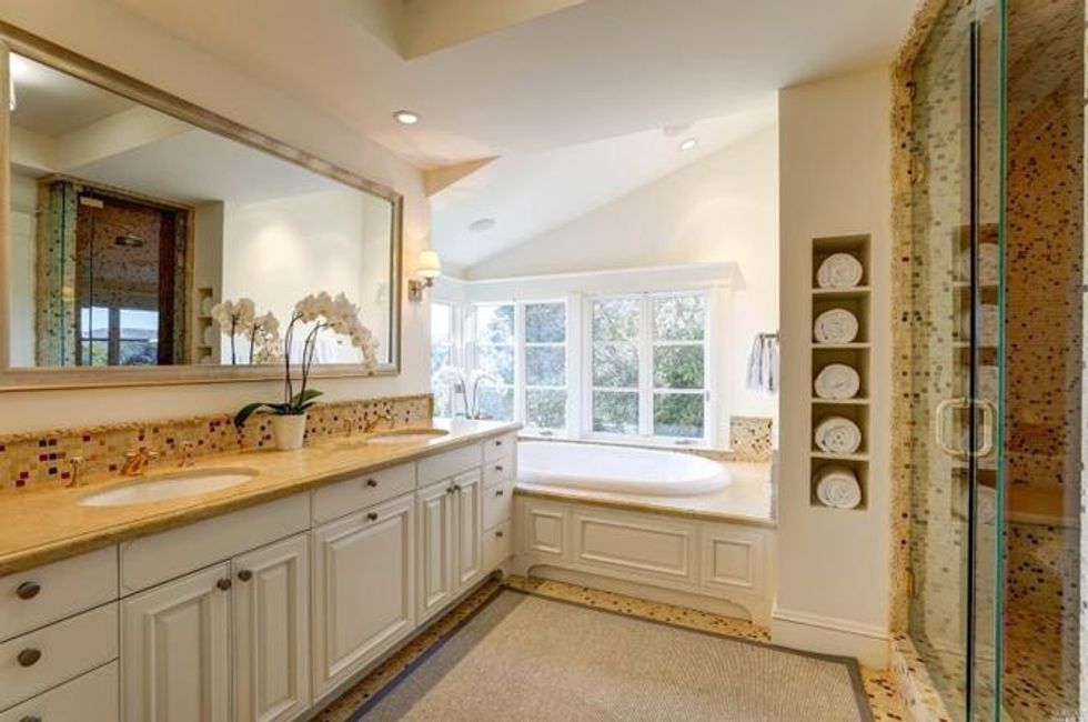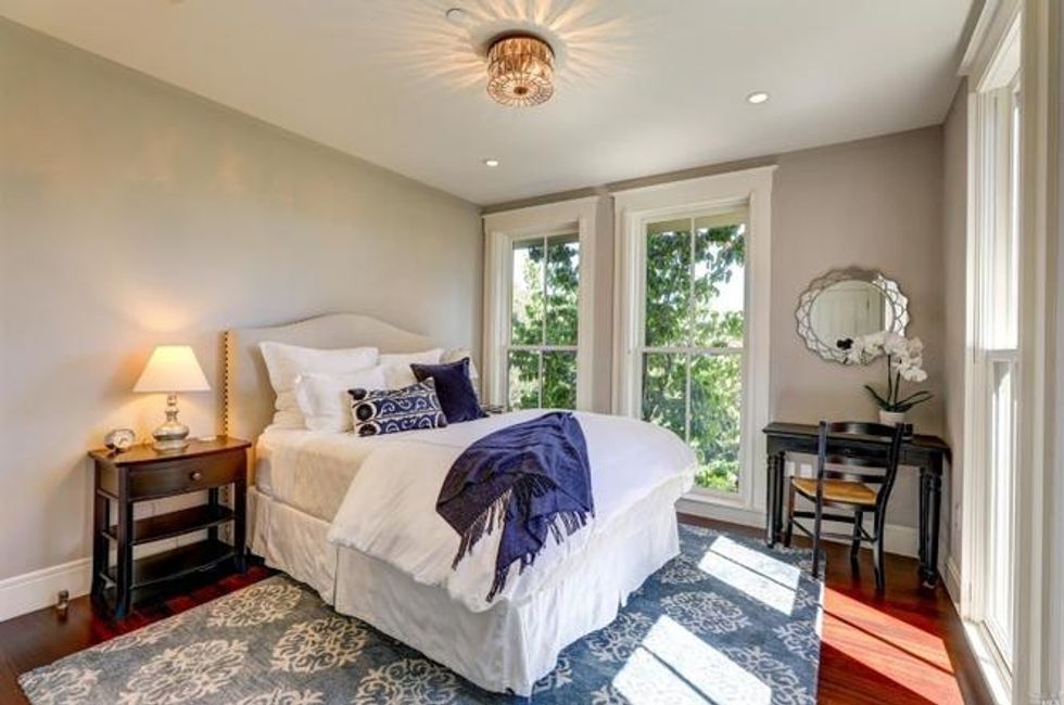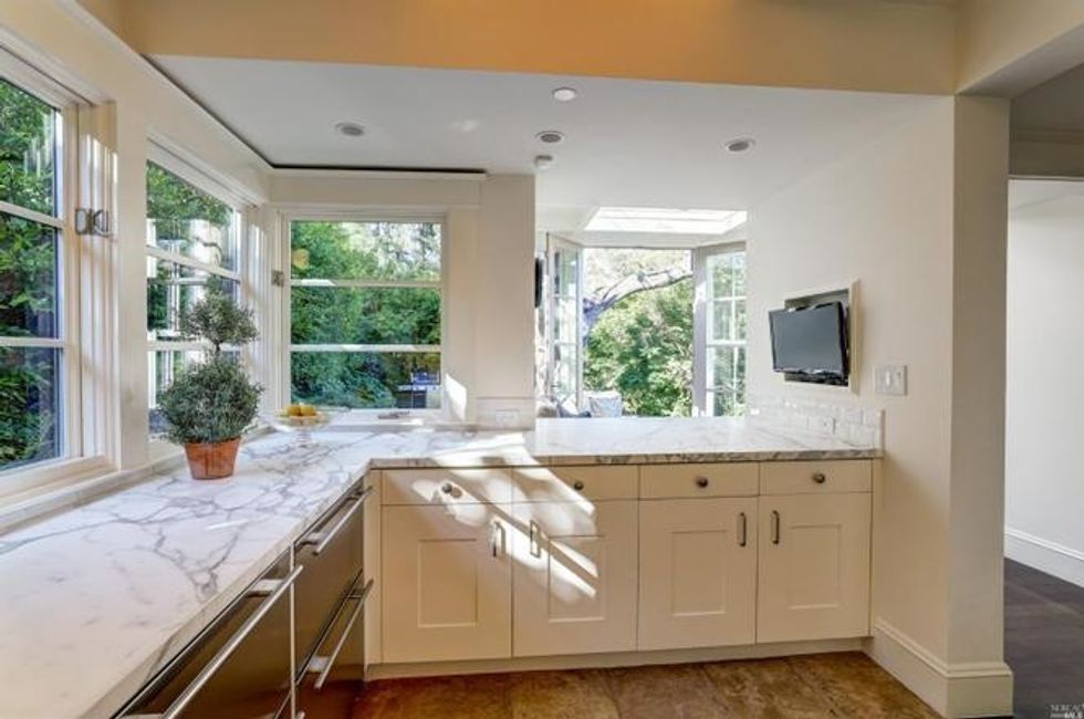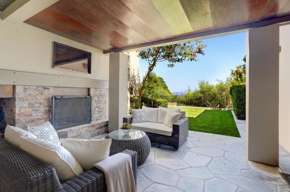 On the main level, the living room has all the hygge vibes with open beams, picture windows, and a large fireplace. The bright kitchen has Calacatta marble, designer stonework, and an adjacent dining room. After dinner, chill in the family room under a beautiful, arched wood ceiling and grab a book from the built-in shelving. Also on this level is the master suite with lush treetop views looking out to the water and San Francisco; the master bathroom has an oversized shower and soaking tub with its own set of beautiful panoramas.