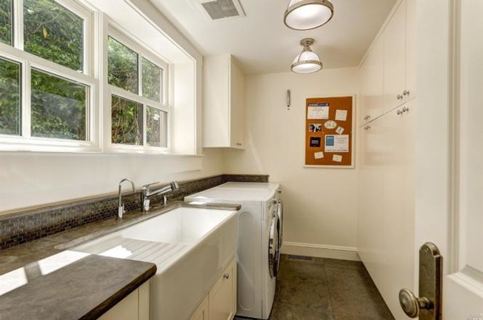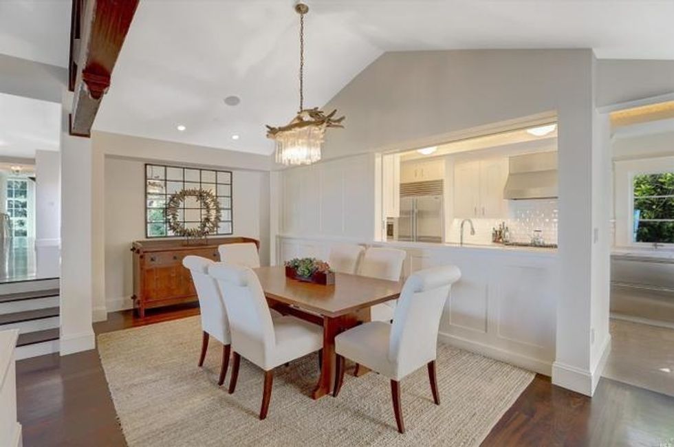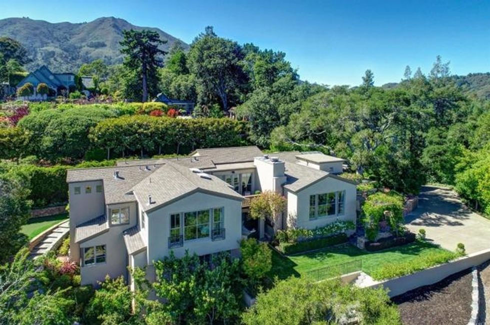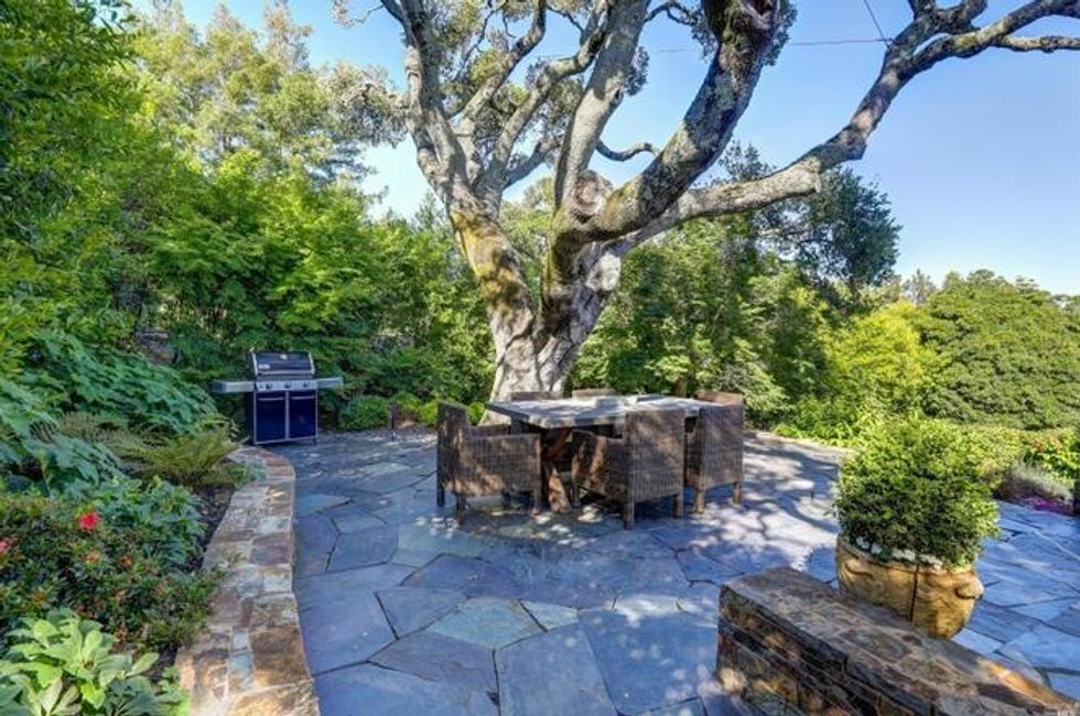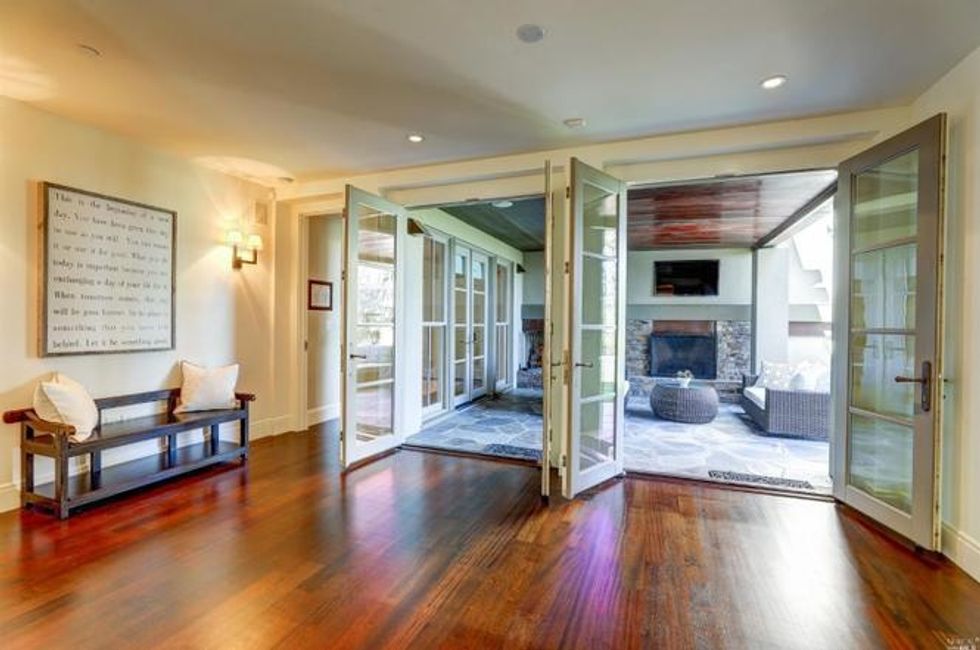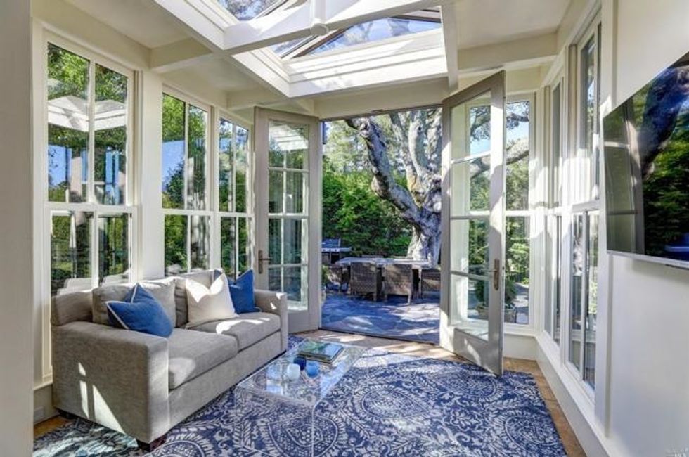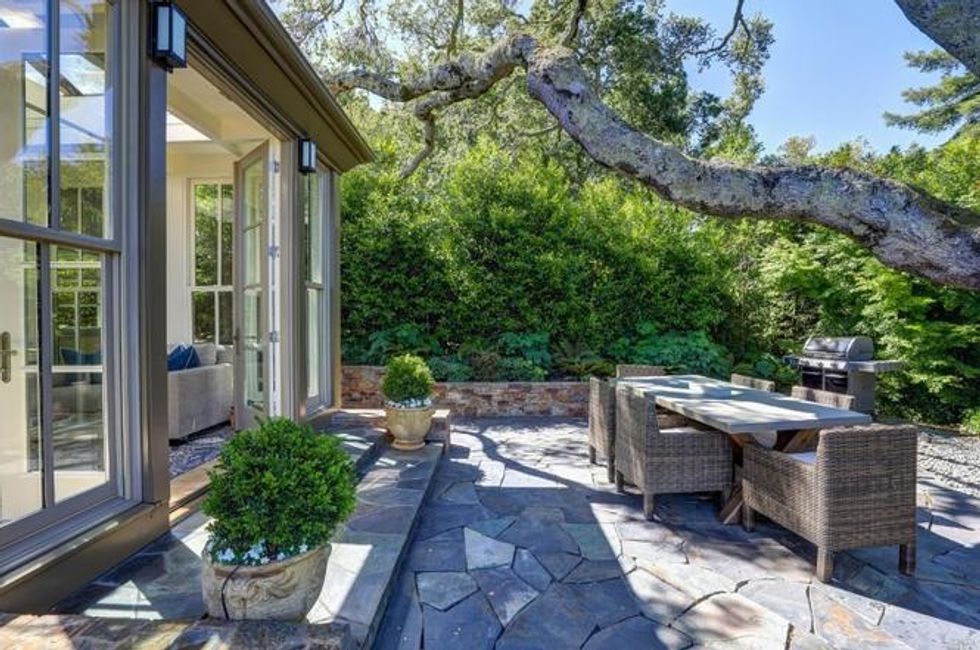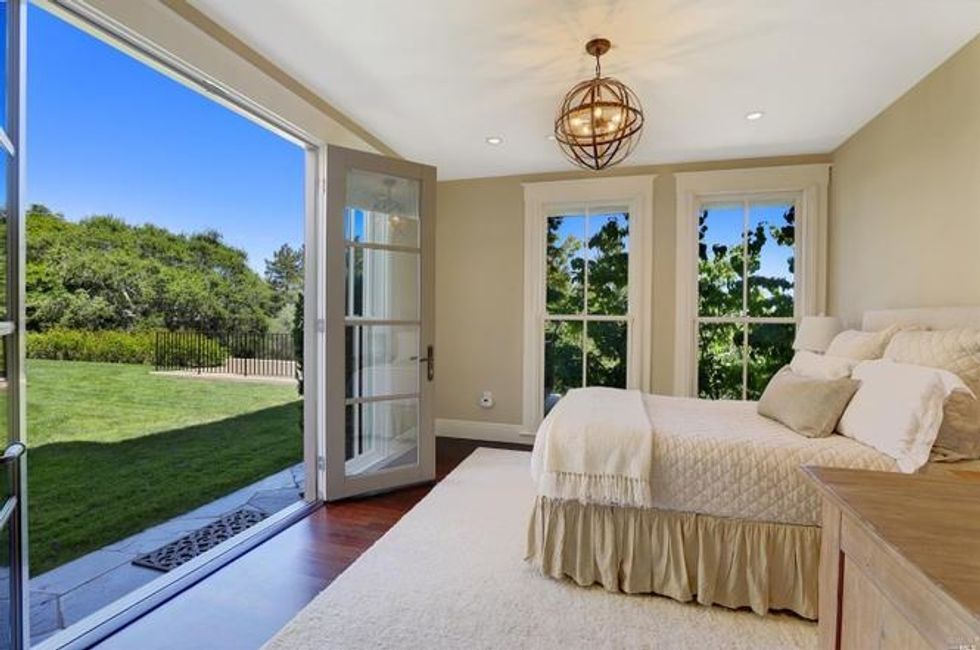 Set on a lush, 30,000-square-foot lot, the house's many large windows and French doors open onto the outdoors for fresh air and views; inside, an open floor plan keeps things tranquil and light.