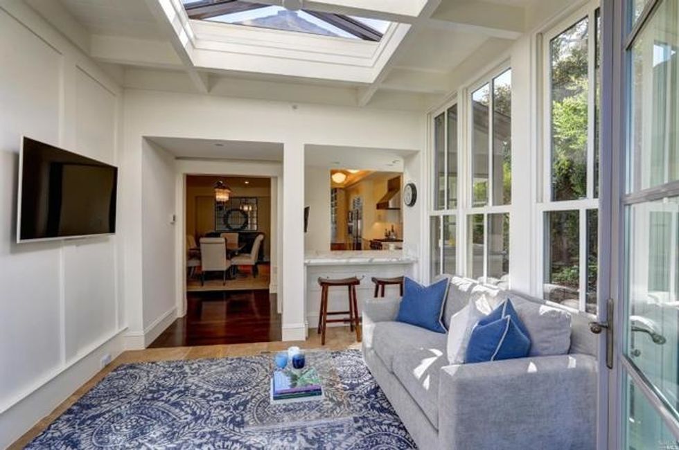 The lower level holds another bedroom, family room, and bathroom, as well as access to the garage. Towards the back of the house is another airy space encased in windows and skylights that opens up to the backyard.