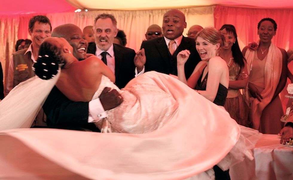 The result? Wedding, South Africa’s entry in this year’s Oscar race, a sharp, poignant comedy about a bridegroom and his best-man-to-be, played by Nkosi and Seiphemo, traveling that same 1,100-mile road from Johannesburg to Cape Town. Complicating matters is the white English doctor, played by Perrier’s Bounty’s Jodie Whittaker, whom they meet along the way.