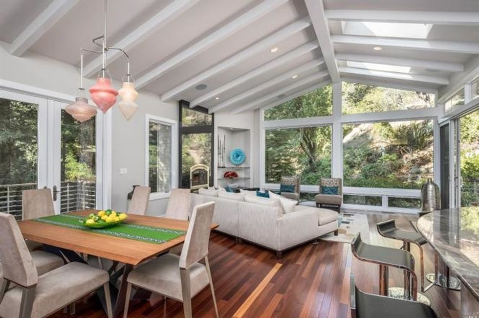 Newly remodeled, the three-bedroom, two-bathroom house has grand architectural elements such as cathedral ceilings in the great room, Brazilian cherry hardwood floors, Pella & Anderson doors and bay windows, and custom Italian lighting.