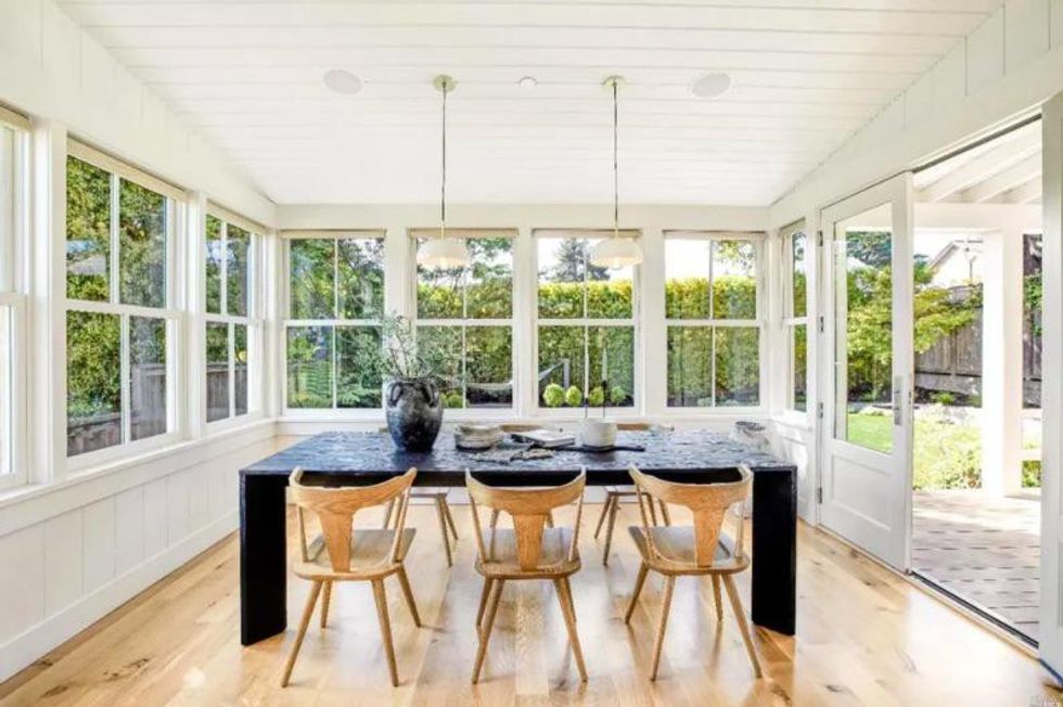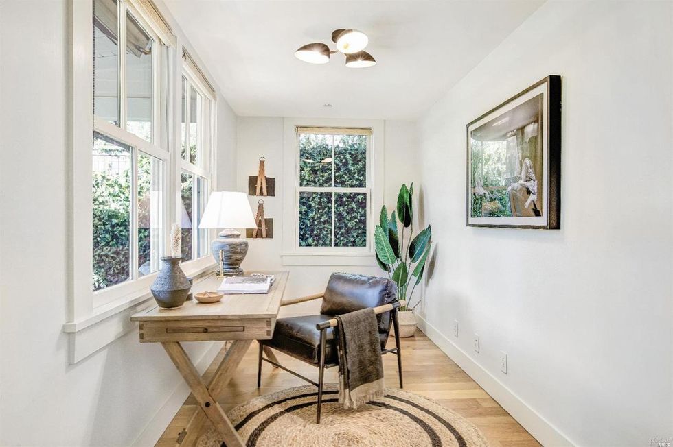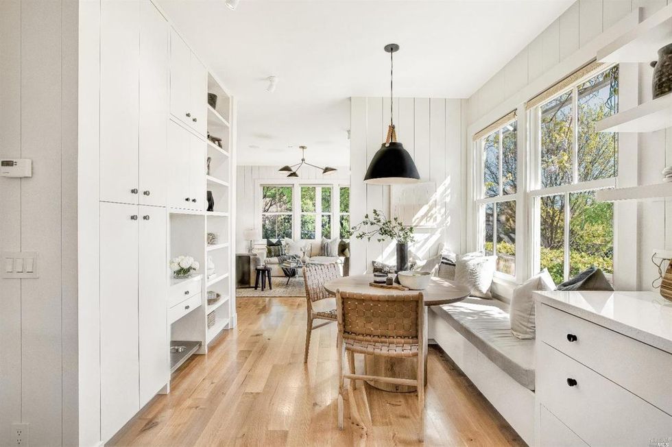 Sunshine lights the 2,555-square-foot open floor plan with lots of windows and high ceilings, and each room here feels intended for relaxation. The Venetian plaster fireplace in the living room is a lovely spot to curl up on cool nights. The kitchen invites everyone to hang out with a sizable eat-in counter, a bright breakfast nook, and an open dining area that doubles as a sun room with windows and a sliding glass door that open to a garden blooming with gardenias. Built-in cabinets and shelving provide space to display collections and cookbooks.