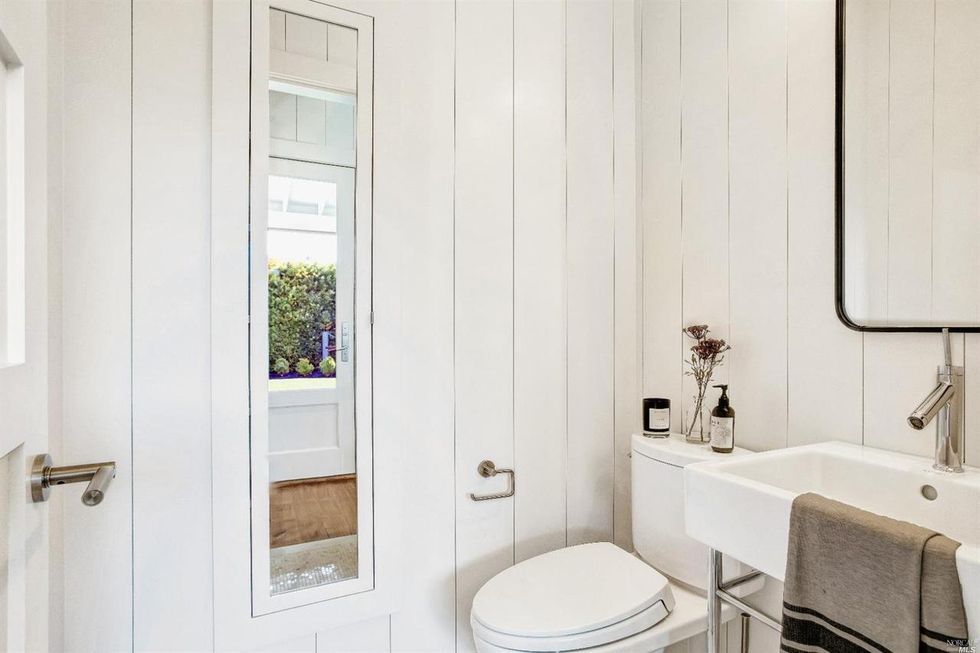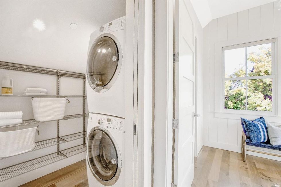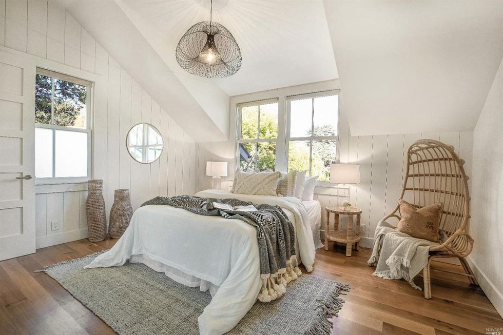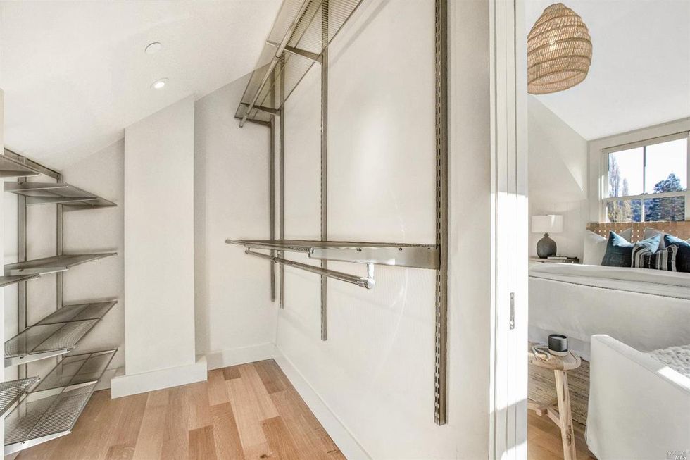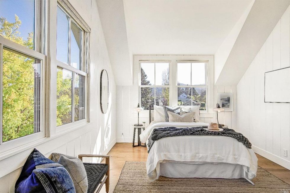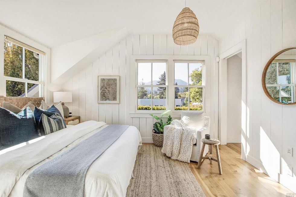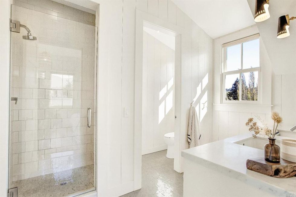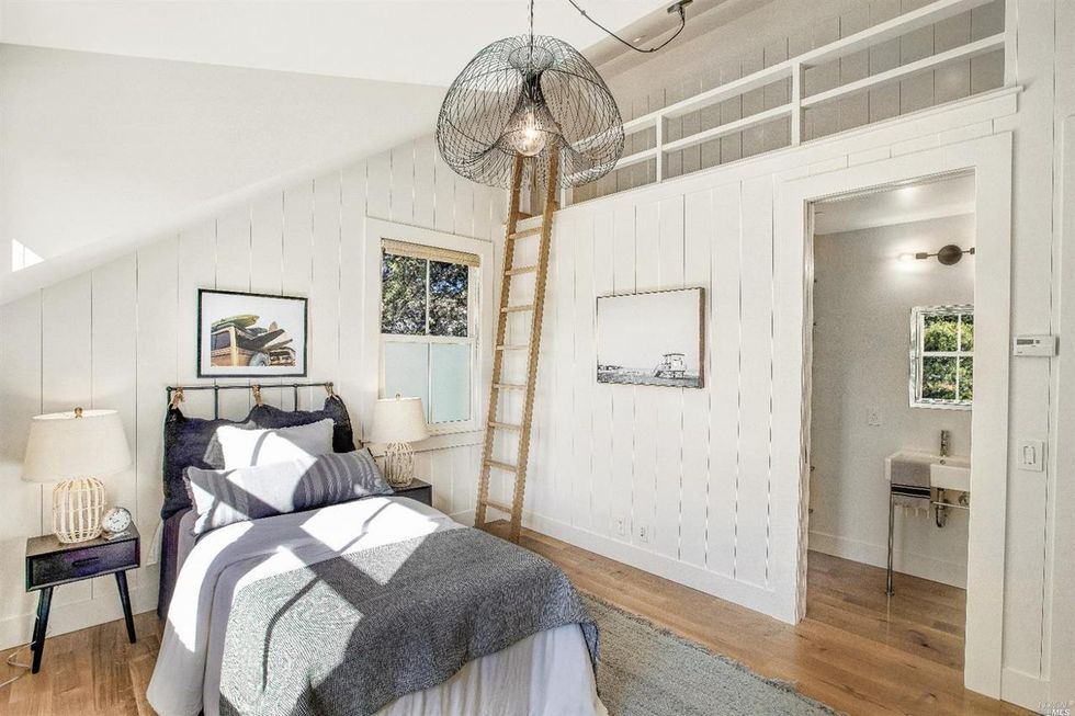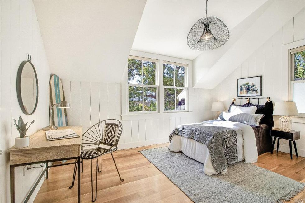 There are four bedrooms, each with high pitched ceilings, on the second level. The primary suite has views of Mt. Tam, plenty of closet space, and a pretty-yet-practical bathroom with a dual sink vanity with ample storage and a roomy walk-in shower. A laundry room and loft finish out this space.