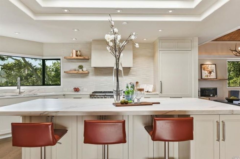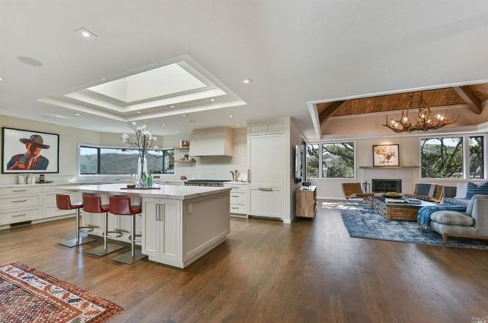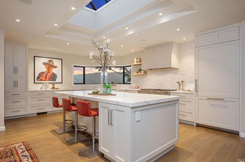 Adjacent to the living room is a freshly remodeled kitchen with the same high ceiling and natural light pouring through the center. Teamed with a great room and formal dining area that open up to outdoor spaces for lounges, this is an ideal setting for entertaining.