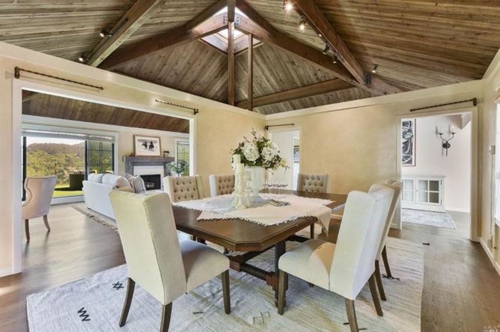 A grand foyer serves as the entrance to the main level where there are hardwood floors and art lighting throughout to please obsessive collectors. The large living room feels airy with a high, vaulted ceiling and skylight, while a new fireplace with a reclaimed wood mantle adds a bit of coziness.
