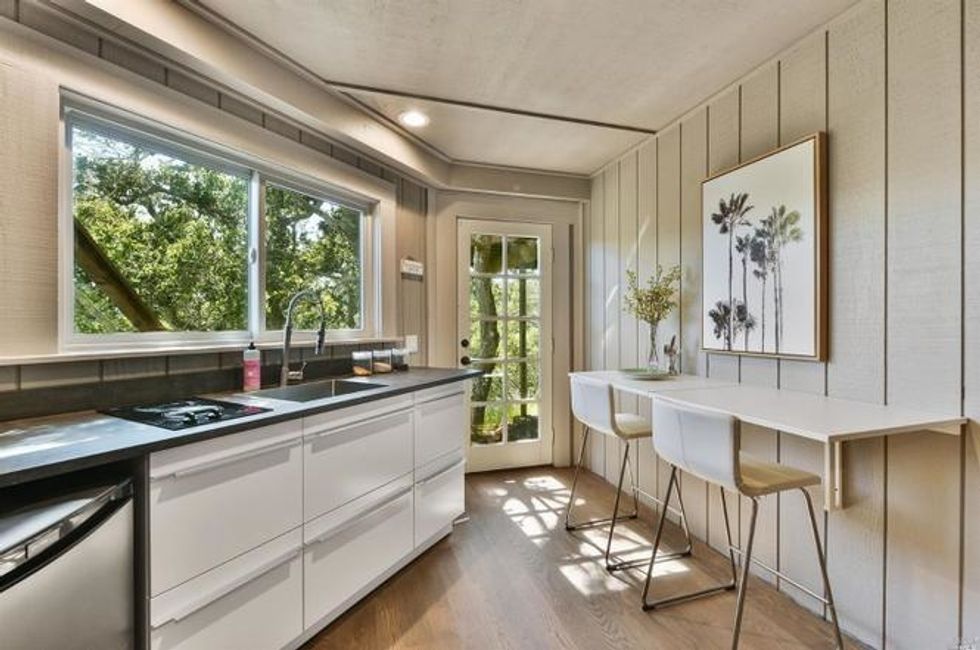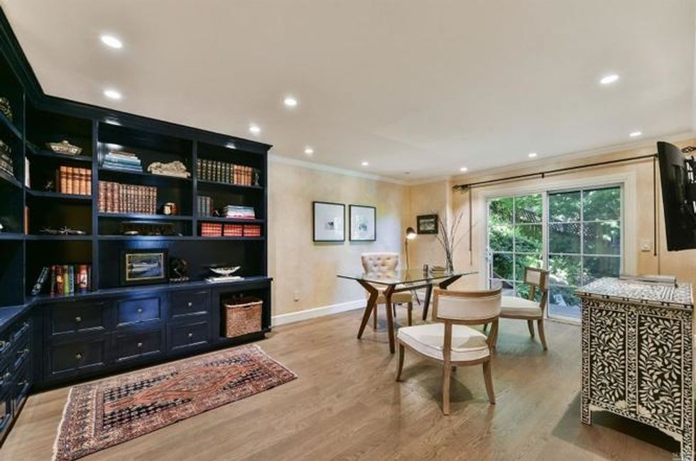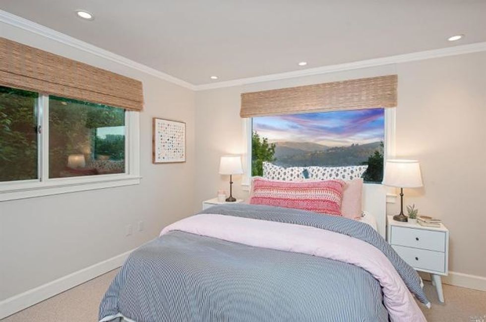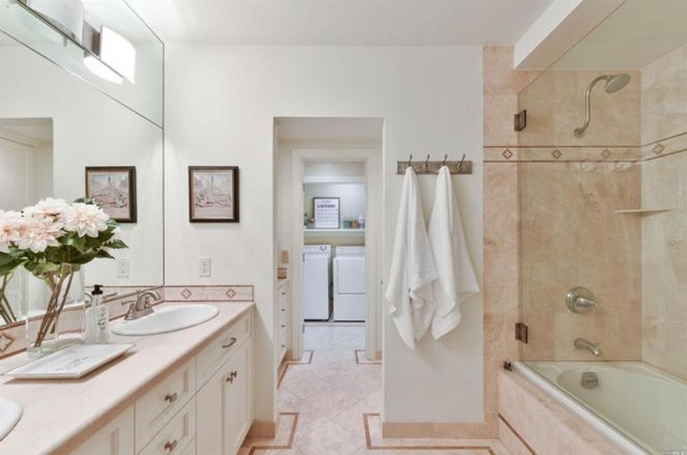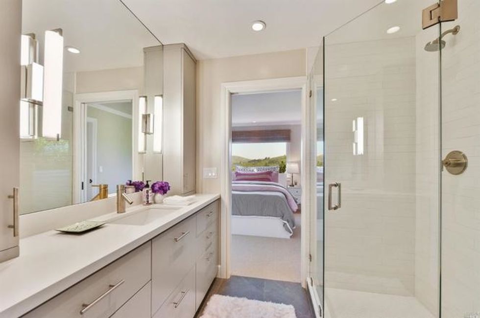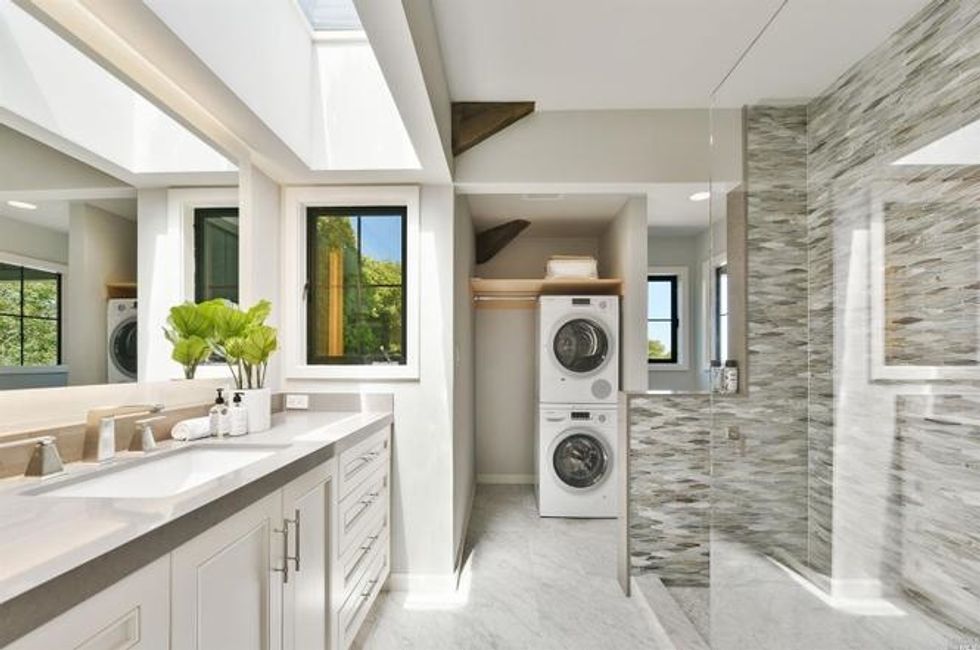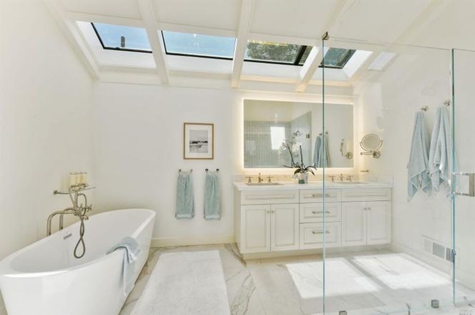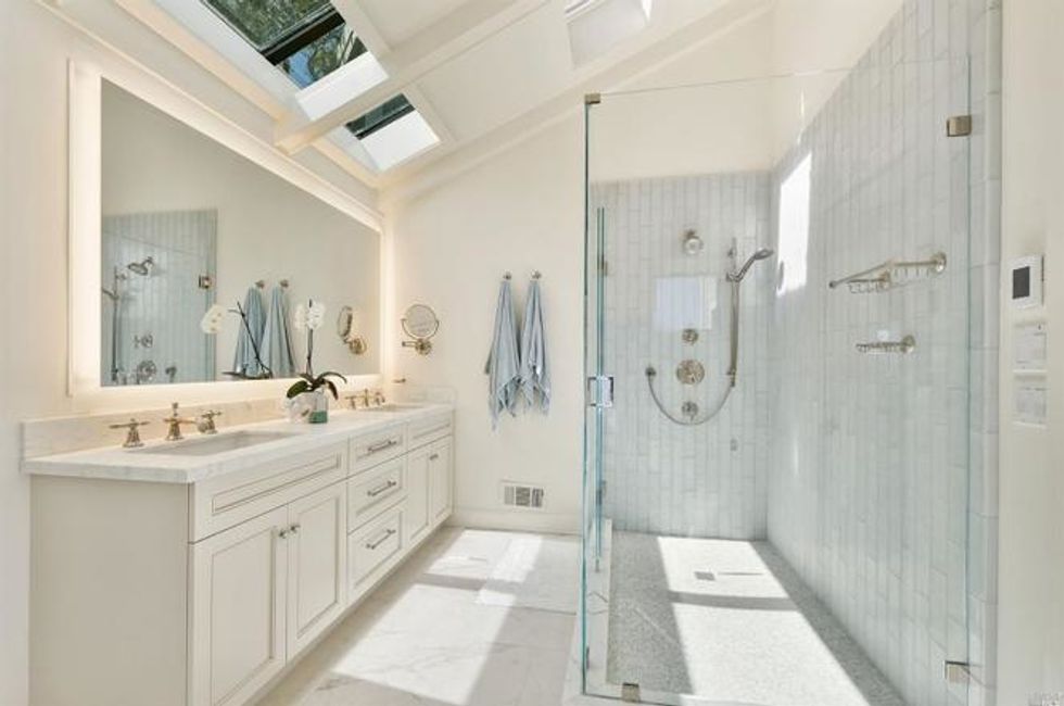 Four bedrooms take up the bottom level where the master suite has bay windows, access to a private deck, and sun-soaked marble bathroom with heated floors, a soaking tub, extra-large shower, and double sink vanity. Rounding off the suite are dual walk-in closets—there's no sharing required here. Two other bedrooms on this floor share a bathroom, all of which have new floors, custom showers and cabinets, stone counters, and new fixtures. A third room with en suite bath, washer/dryer, and separate entrance provides privacy for guests, an au pair, or home office.