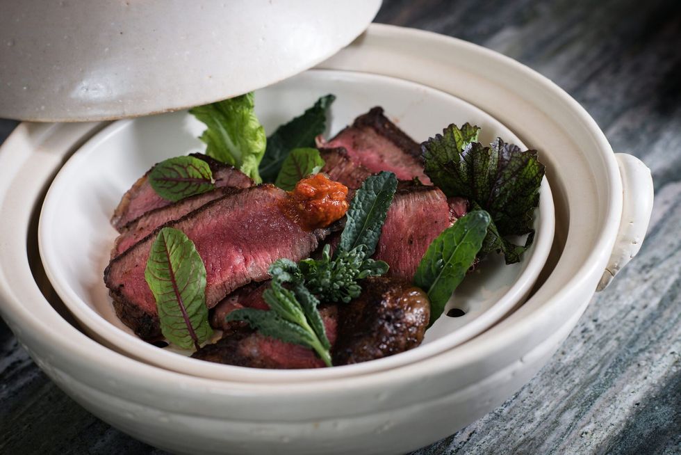 Yet this beast was one of the best steaks I've ever enjoyed, served on the bone and sliced into thick, glistening, impossibly juicy slabs and dressed in green garlic-and-ginger butter and charred leeks.