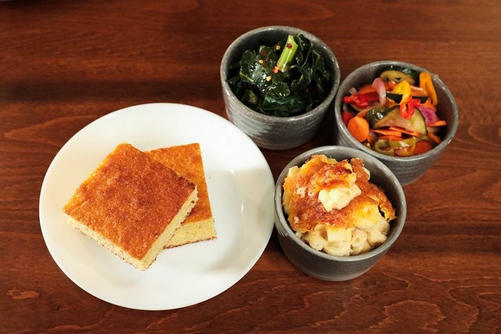 Sides like pie-filling perfect candied yams, creamy mac and cheese made with rich bechamel and three types of cheese, and moist brown butter cornbread hold their own against the main course. The chef’s explosively flavorful braised greens are, surprisingly, completely vegan.