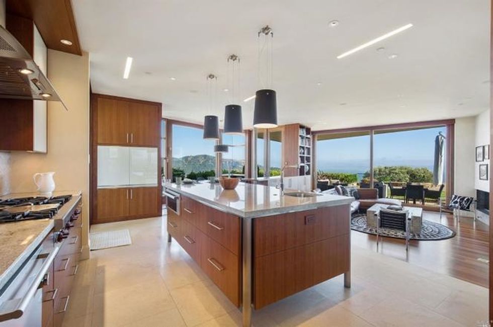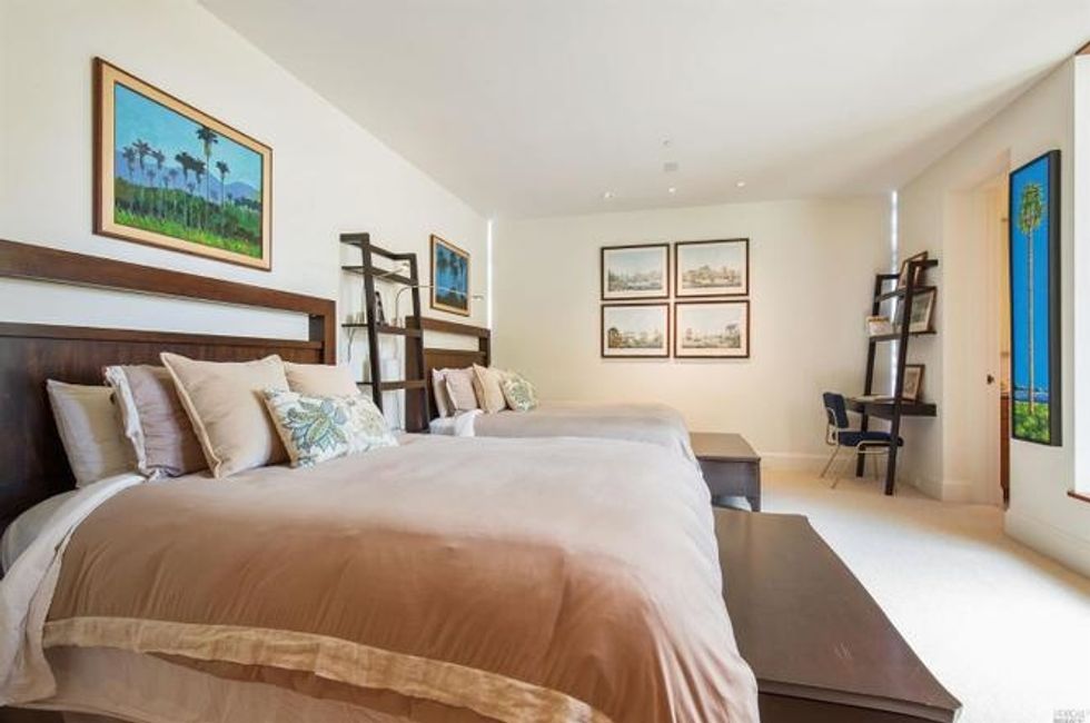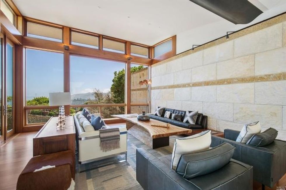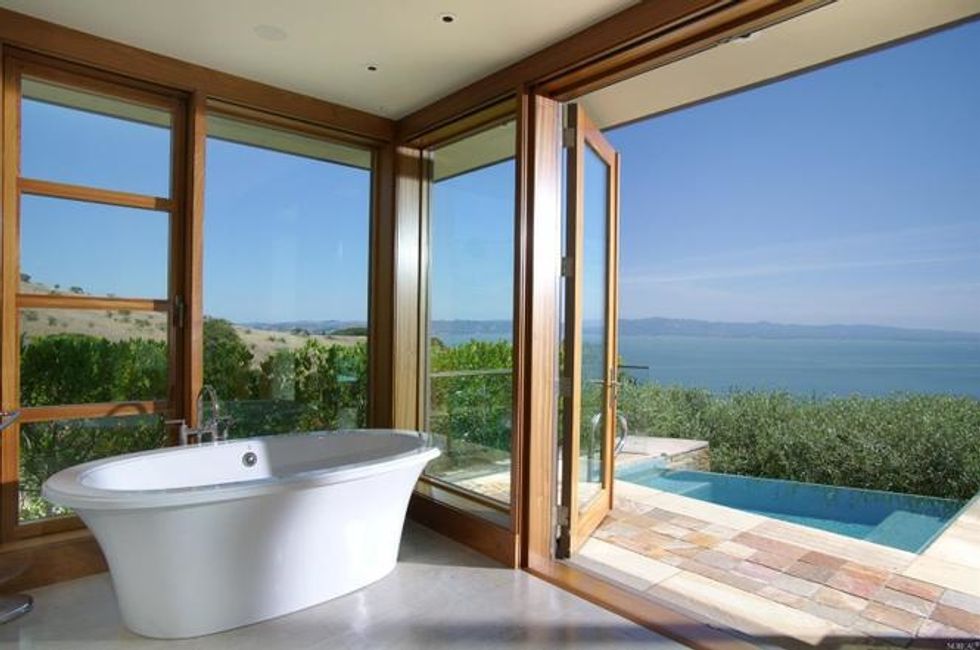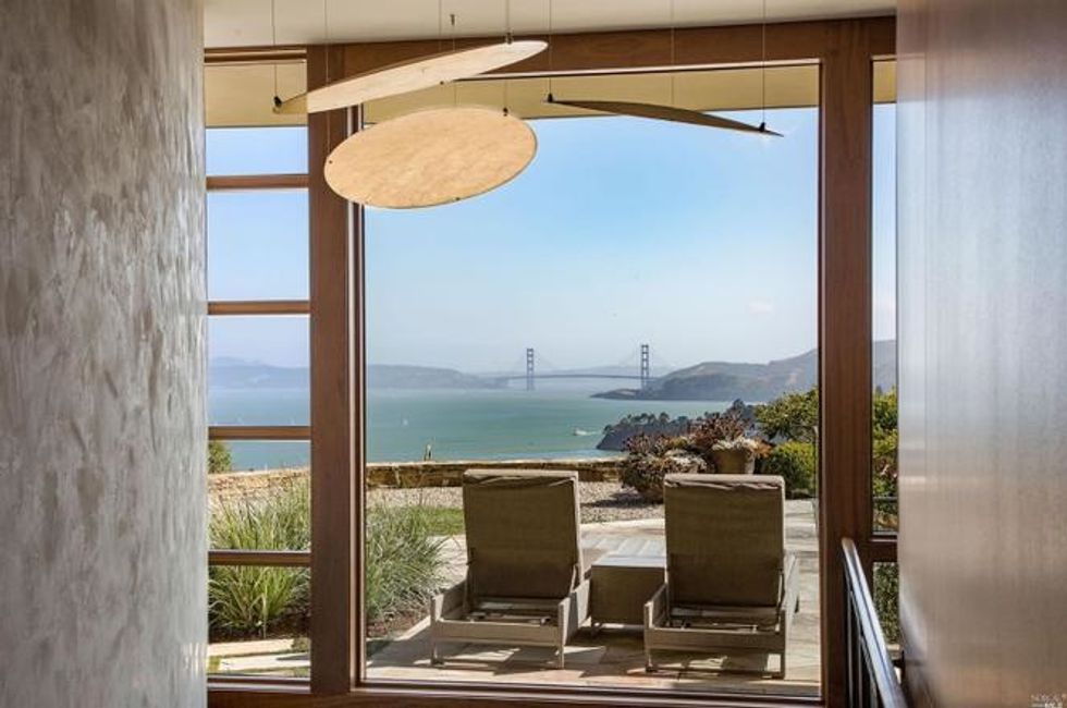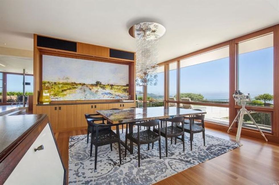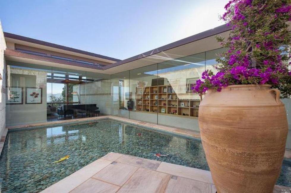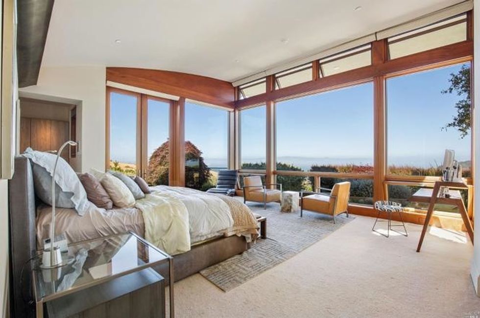 Next there the great room at the heart of the home, where a formal dining area has a glass bauble chandelier and the living space is designed to make you feel as if you're floating above the bay. Naturally it's surrounded by massive windows to take in vistas of SF, Angel Island, and the Marin Headlands—these are truly sweeping panoramas, people. Along the northern end of the room is a glass wall peering into the reflecting pool with swimming koi; and just beyond that are three more bedrooms, each with Brazilian cherry closets, en suite baths, and access to the lawn and patio with its circular skylight and firepit.