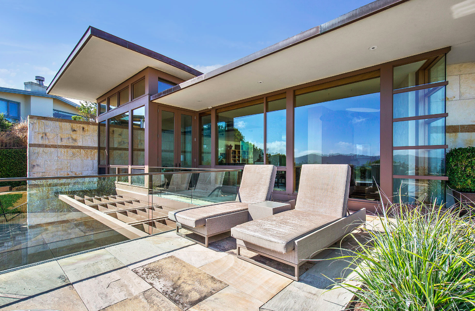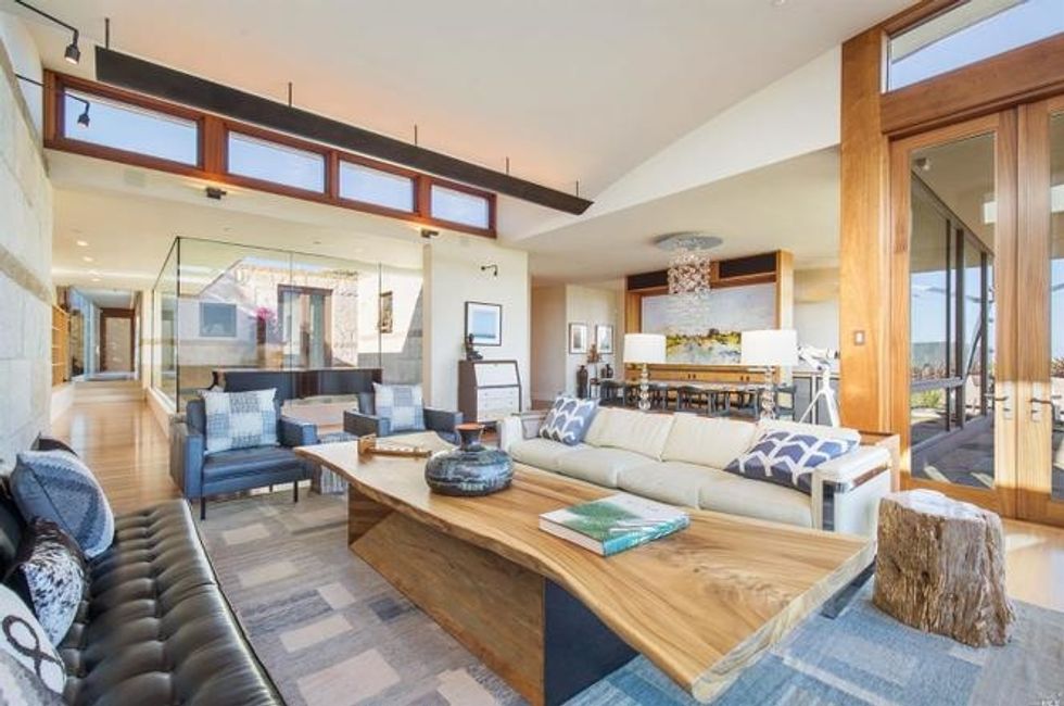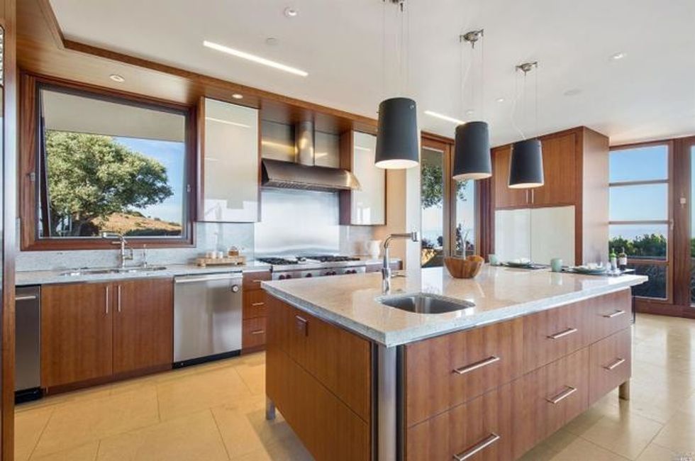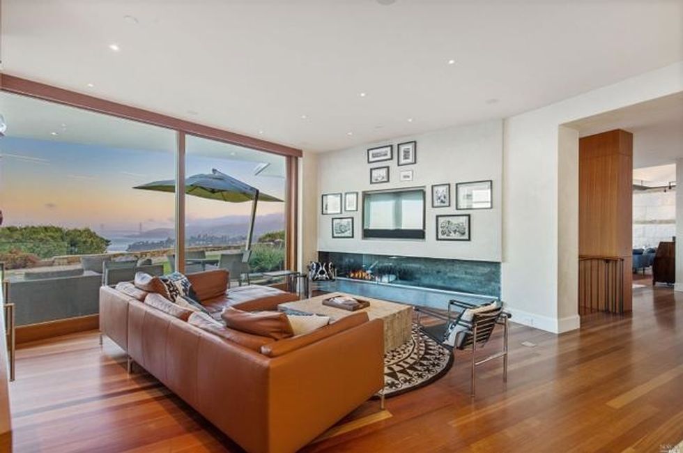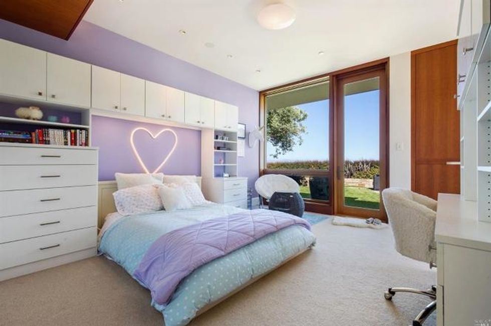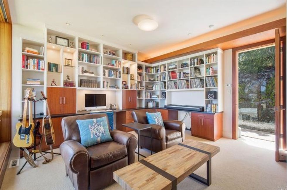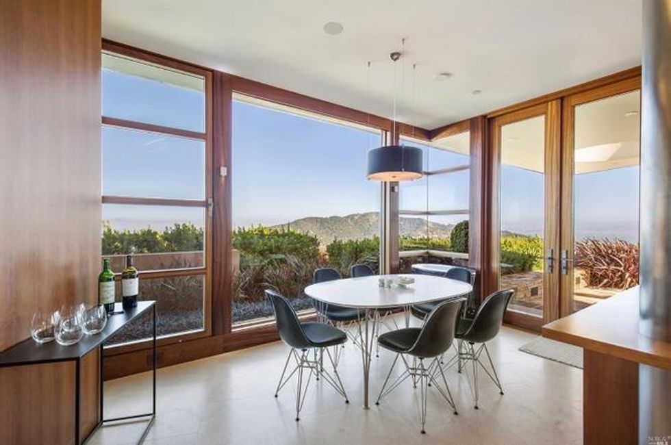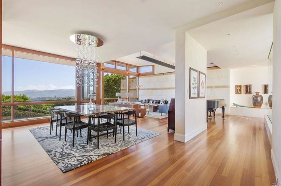 Next there the great room at the heart of the home, where a formal dining area has a glass bauble chandelier and the living space is designed to make you feel as if you're floating above the bay. Naturally it's surrounded by massive windows to take in vistas of SF, Angel Island, and the Marin Headlands—these are truly sweeping panoramas, people. Along the northern end of the room is a glass wall peering into the reflecting pool with swimming koi; and just beyond that are three more bedrooms, each with Brazilian cherry closets, en suite baths, and access to the lawn and patio with its circular skylight and firepit.