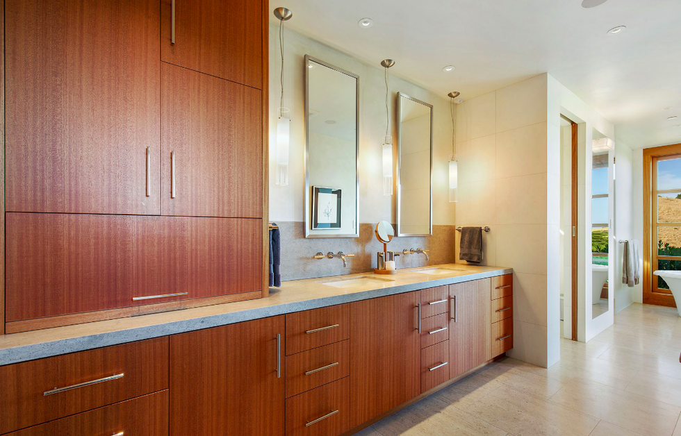 Finally, we make our way to the master suite, which you could easily think of as your own private spa. It, too, has views to write home about, but also a huge walk-in closet. Shoe addicts, brace yourselves: There is a separate closet just for you. The bathroom is plenty luxurious with its own steam room, a shower built for two, and a free-standing tub thatlooks out over the pool and ocean. Double doors open up to a private stone patio with blue mosaic infinity spa. This is living.