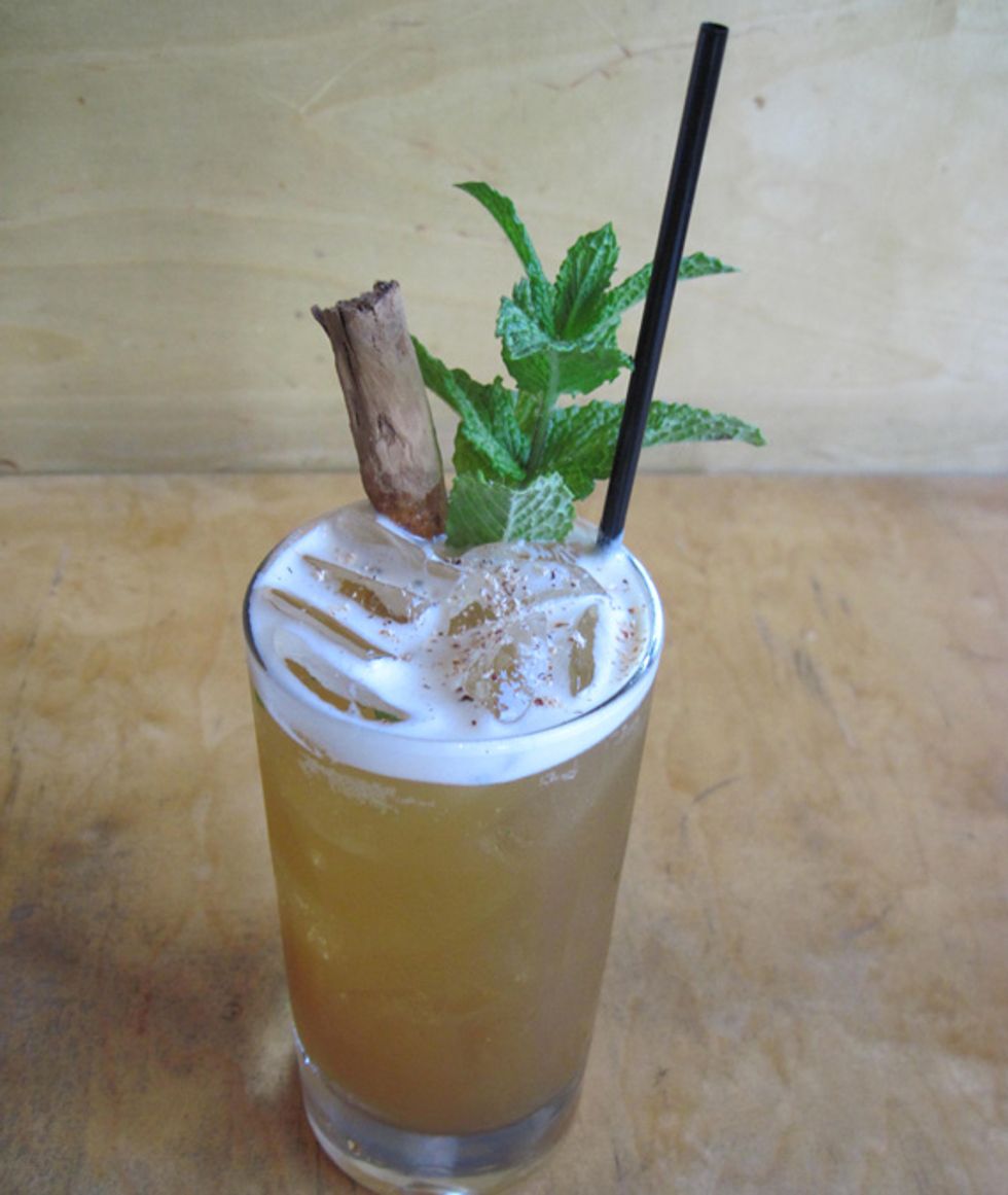 Combine all ingredients in a mixing glass with ice. Shake well and strain into and ice-filled collins glass. Garnish with a mint sprig, long cinnamon stick and a little grated nutmeg.
