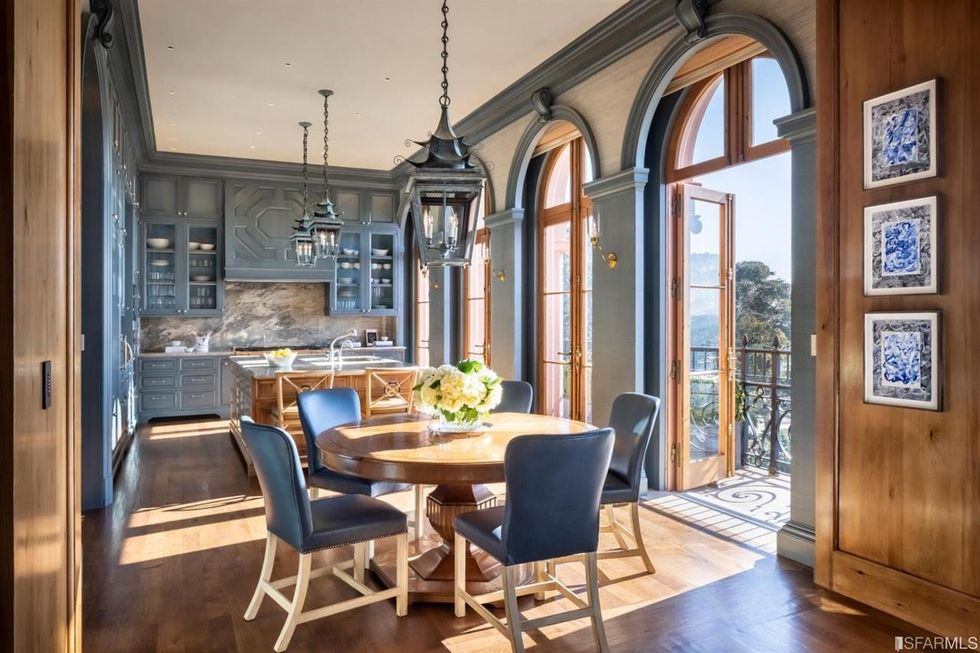 The main kitchen is our favorite room in this home, a fresh reprieve from so much formality. Painted blue with a complex strié technique, the more casual space has an oversized island topped with a slab of granite, two hidden walk-in pantries, arched French doors, and a great morning view of the Golden Gate Bridge from the wraparound terrace. There is an additional catering kitchen with access to the service elevator.