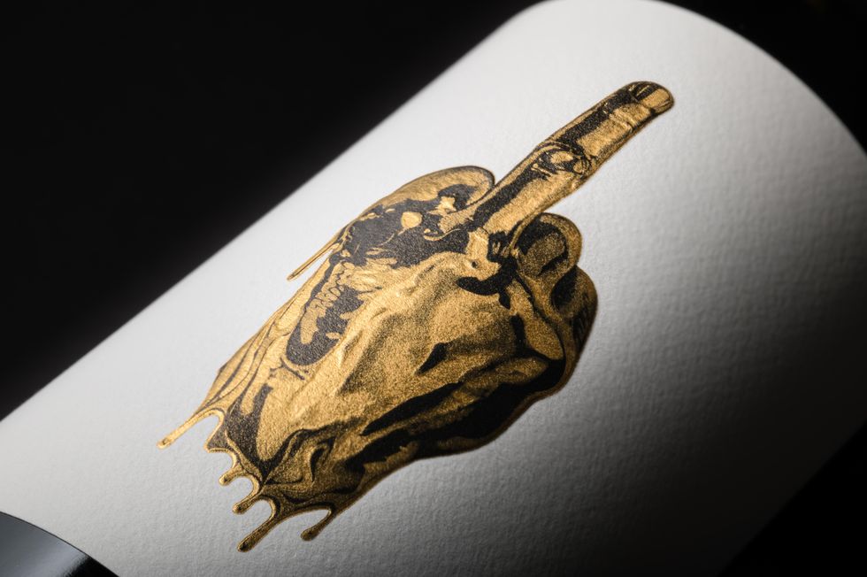The bottle itself is a looker, dipped in black wax with the striking label designed by Italian artist Alessandro Paglia, who created a sculpted, hyper-realistic gold middle finger by superimposing several layers of chaotic lines on top of one another.