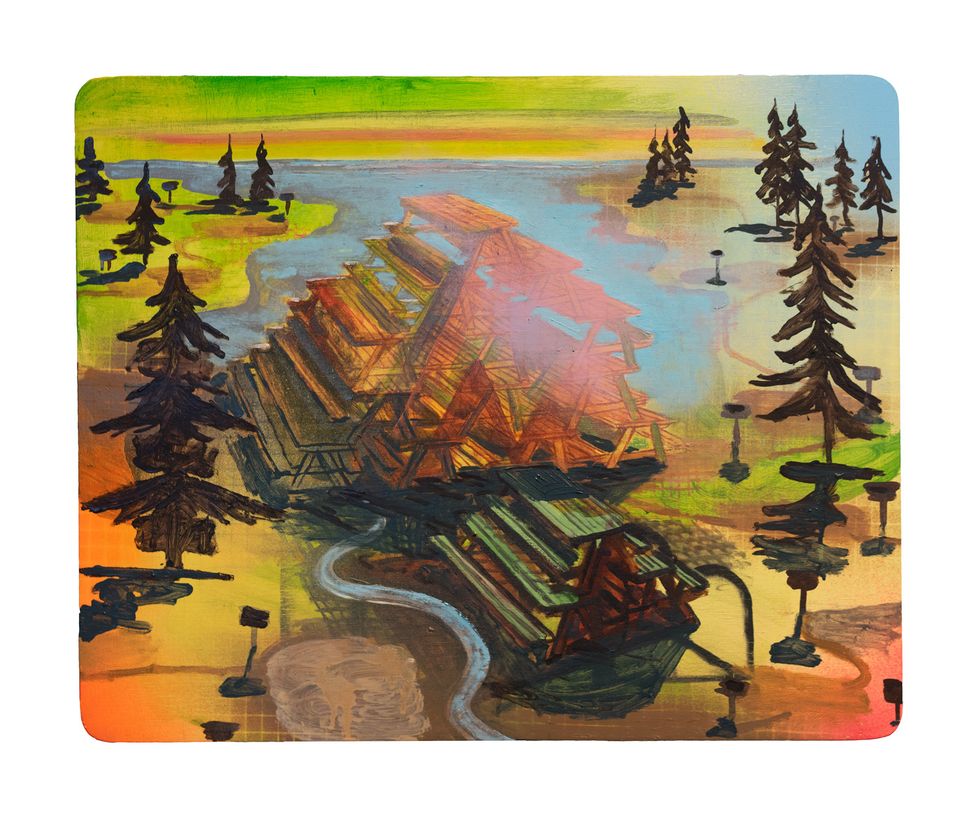 At the entrance of the gallery there are stacked barrels with signs that read, "No Re Entry," "What goes in dirty," "Comes out clean." On the left side of the main door there is a water fountain made of coolers, and on the right side, a souvenir shop filled with an array of objects and books. This first part of the exhibition wants to emphasize the fragility of human beings when immersed in a natural landscape. "I painted a camper without a wheel to symbolize bringing your home to nature but then something goes wrong, and you need to change your attitude, your plan, and your initial intention, " explains Parsons. Go a little further and you'll see a reproduction of the legendary firefall in Yosemite. "I am not trying to paint pretty pictures, but I am trying to paint something that has a criticality, that evokes a meaning that goes beyond the image you see."