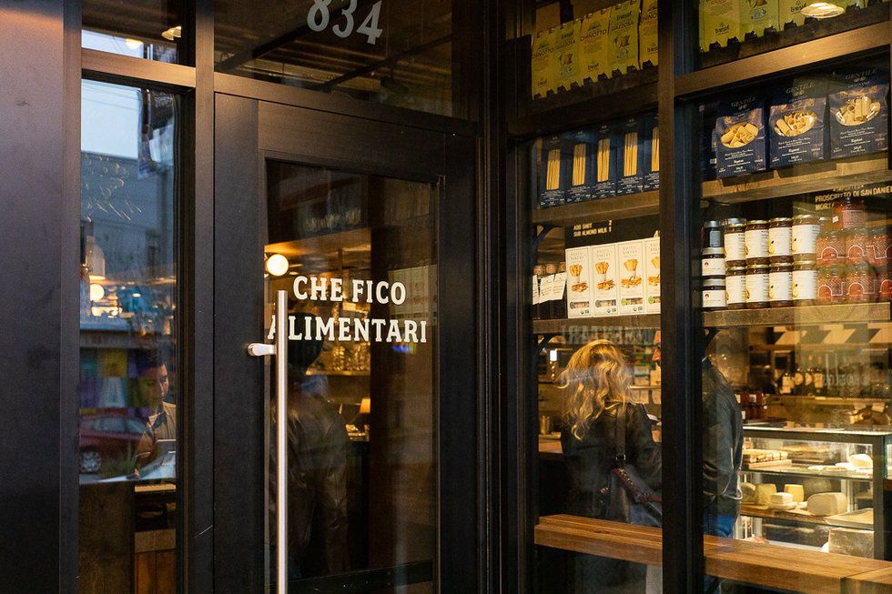Che Fico Alimentari serves handmade pastas and pizzas within a retail space stocked with Italian pantry staples.