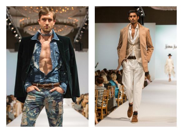 "What I love about fashion is that we invent the rules, and we break the rules," he said, as he presented unexpected looks such as a white leather motorocycle jacket for evening, a brown animal print scarf with a green evening gown, or (for guys) bleach-splattered denim with a luxurious velvet jacket.