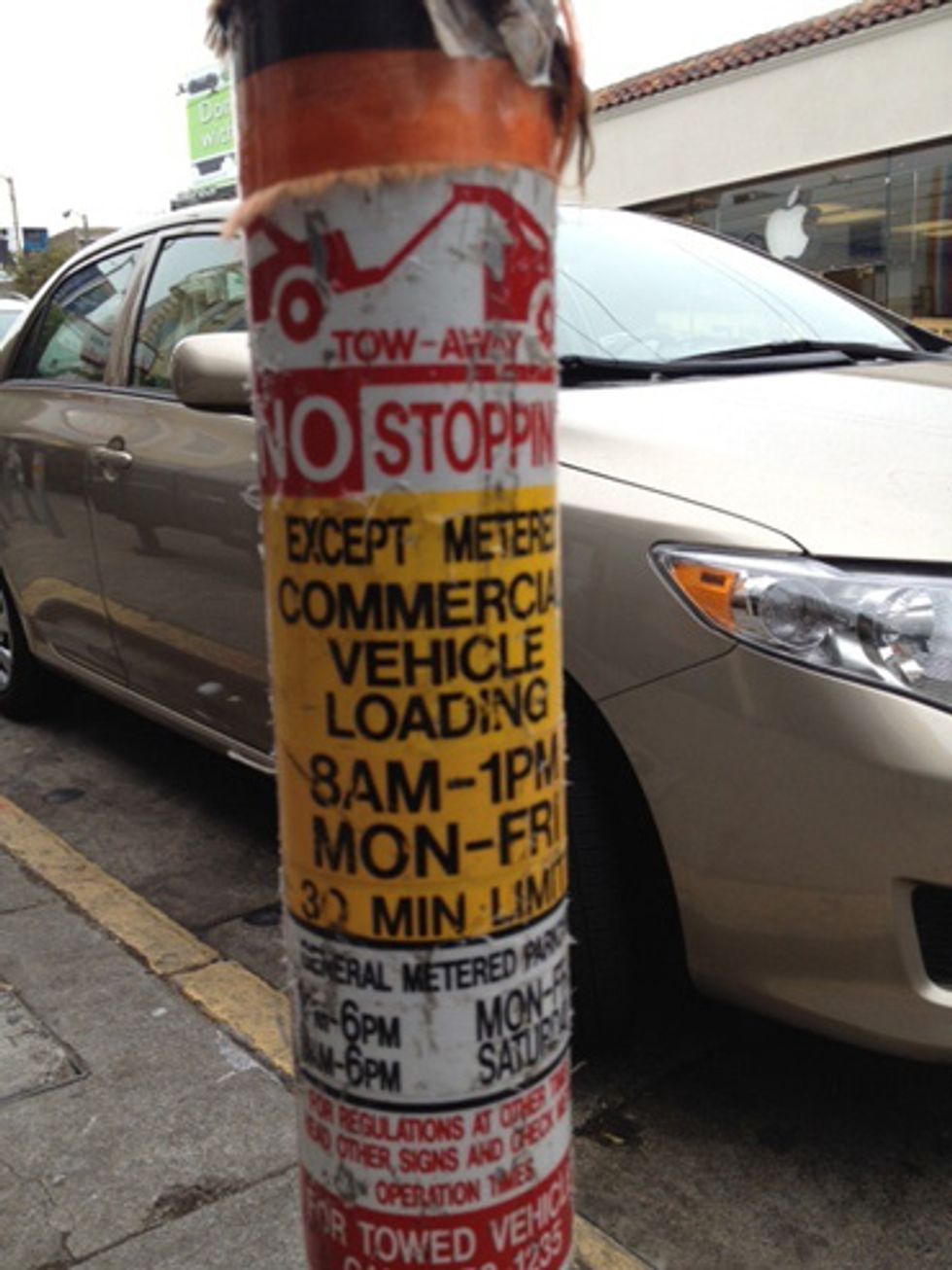 The real trick I think is to get at the proper angle to read it. You'll notice that SFMTA has posted these informational stickers on the pole at an angle that does not face the street at a 90 degree angle, nor at a 45 degree angle, but at an angle that their engineers determined made it the absolute most impossible to read from a car.