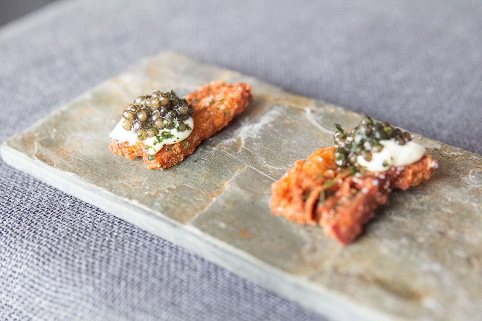 If you have dined before at Sons & Daughters, the modern-meets cozy dining room, designed by Debbie McNamara (Matt's mom), will be nothing new. You'll sink into well-stuffed chairs upholstered in charcoal gray and take in the art—strong black-and-white photography—beneath glitzy crystal chandeliers. A tiled fireplace lends a homey vibe. The refined, yet straightforward space allows diners to focus on the food coming from the lively open kitchen, where Moriarty is enjoying having "more control over the entire arc of the menu, [where] dishes work better in relation to each other." The focus now is on "the whole experience," he says.