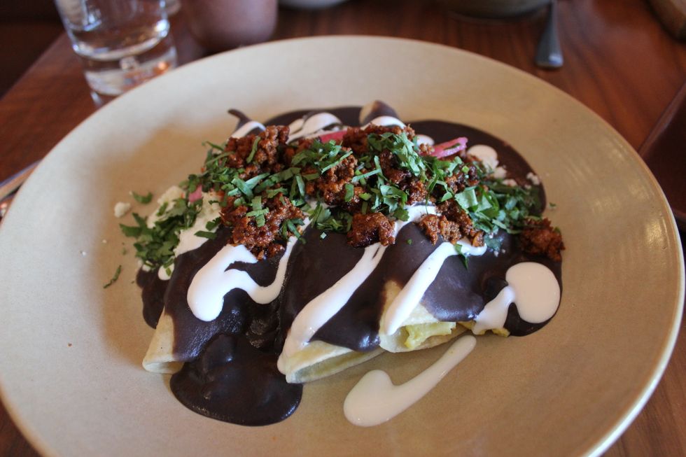 Copita added brunch in March, and it’s all perfect hangover food, starting with Bloody Marias and Micheladas and moving on to divorced chilaquiles, black bean sauce enchiladas with chorizo and scrambled eggs, and “alambres” or skewers of California Kobe flank steak, served with bacon, poblano chiles, a fried egg, and tortillas.