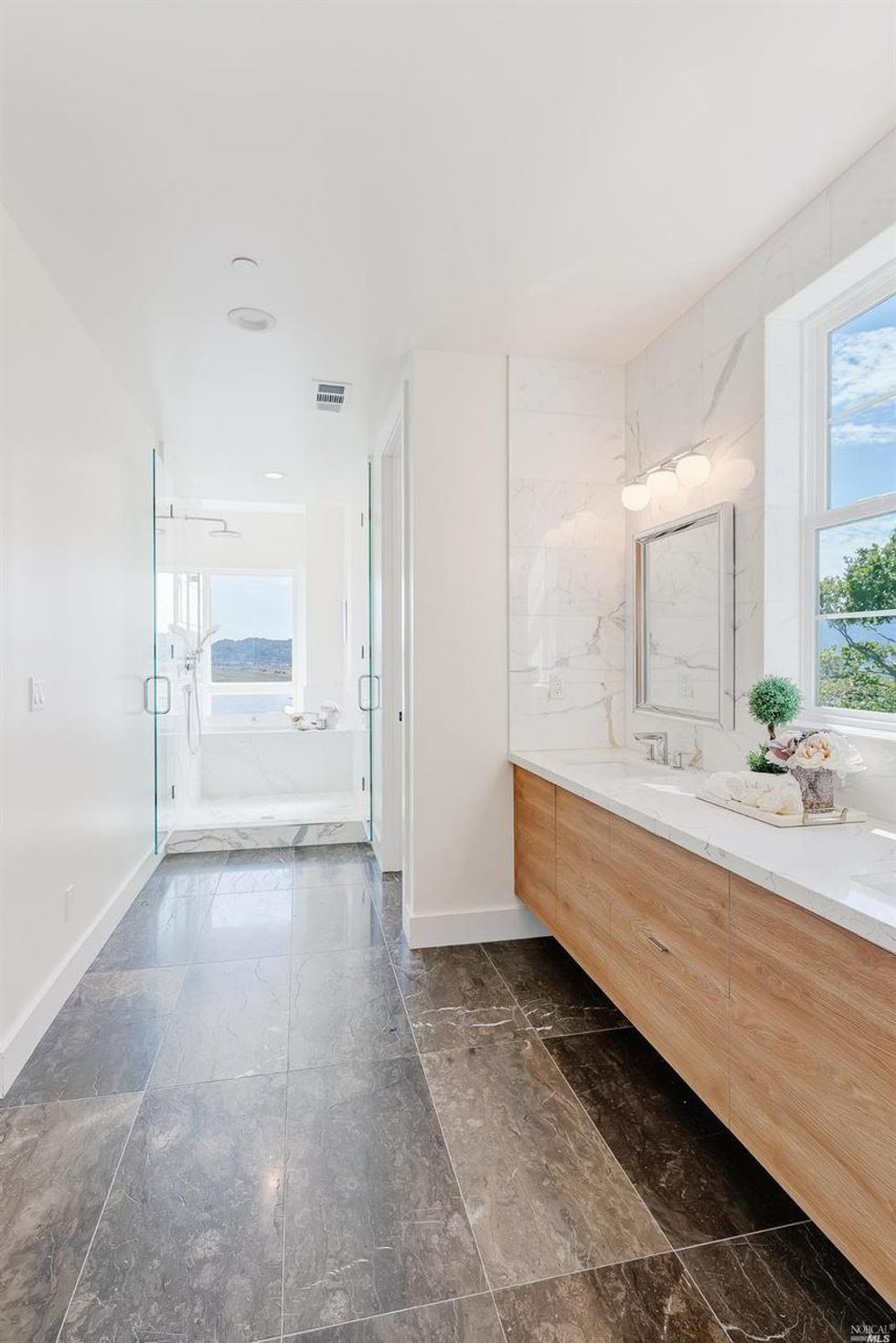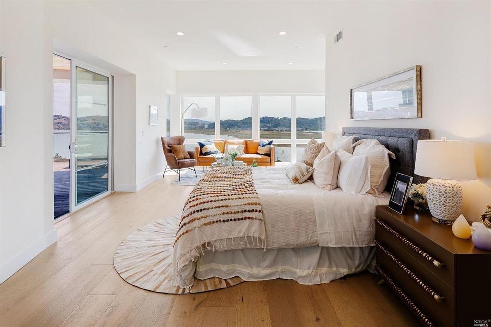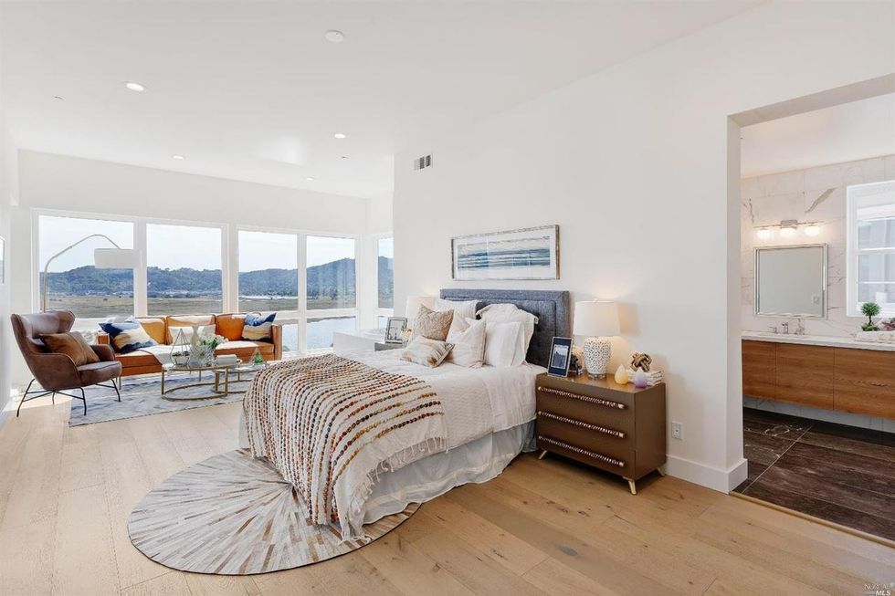 Upstairs, the primary suite has its own living space and a master bathroom large enough for plush seating of its own. Getting ready for a night out will be a treat with a floating dual sink vanity and sprawling walk-in shower. There are gorgeous waterfront views here both from the inside and from the second deck.