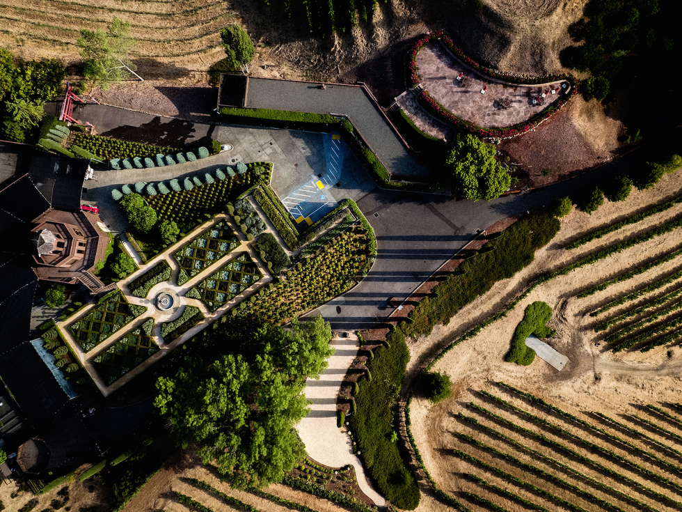 Planted over 40 years ago on the roof of the vineyard's underground cave, this classic French garden is a perfectly geometric maze of planter beds, intricately-cut hedges, shrubs, and spiraled trees. Surrounded by stunning vistas on all sides, it feels on top of the world.