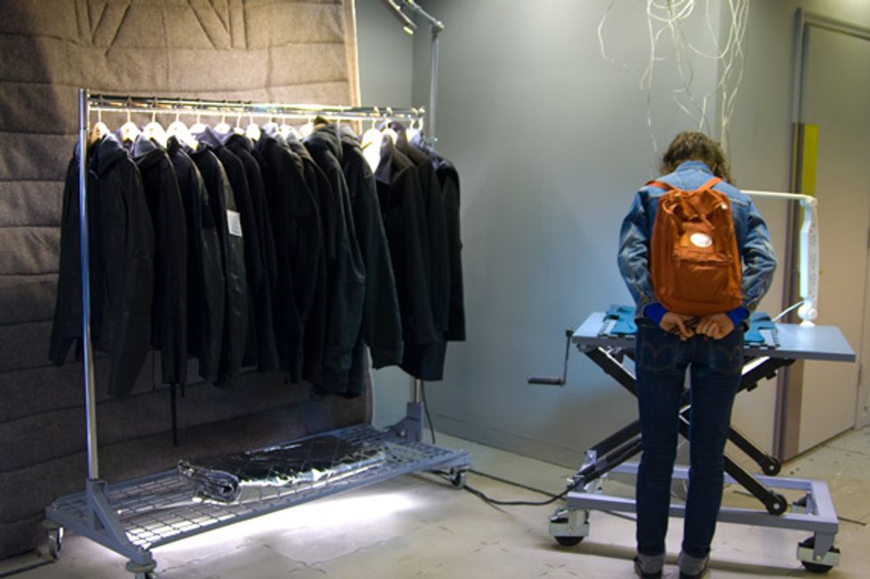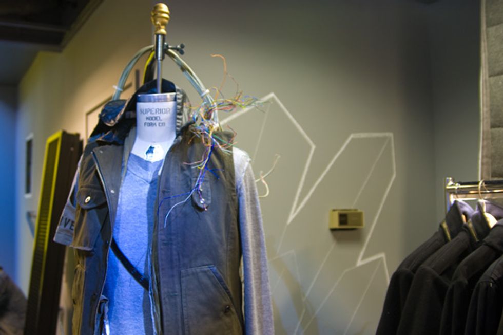 The place is subtle and easy to miss. But inside, they've repurposed old military equipment into showroom material, perfect for NC's signature hard-edged, utilitarian look worn by the likes of Radiohead, Smashing Pumpkins & Gavin Rossdale. Rolling plastic medical supply units are used to transport and display clothing, while nautical sails and army blankets are suddenly dressing rooms, wall decor and a giant entrance tunnel to funnel visitors in.