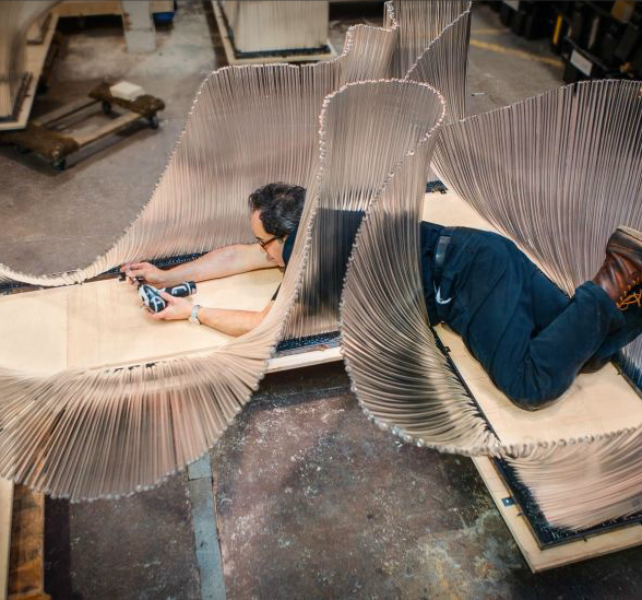 The bulk of Nikolas Weinstein's installations appear in Asia, including a work in progress for a private residence in Singapore that resembles giant falling leaves. The artist credits his ongoing commissions in Asia to the continent's more adventurous tastes in art. His 2011 sculpture inside Tokyo's K-Tower belies all the seismic engineering required to bring it to life. Check out our image gallery here.