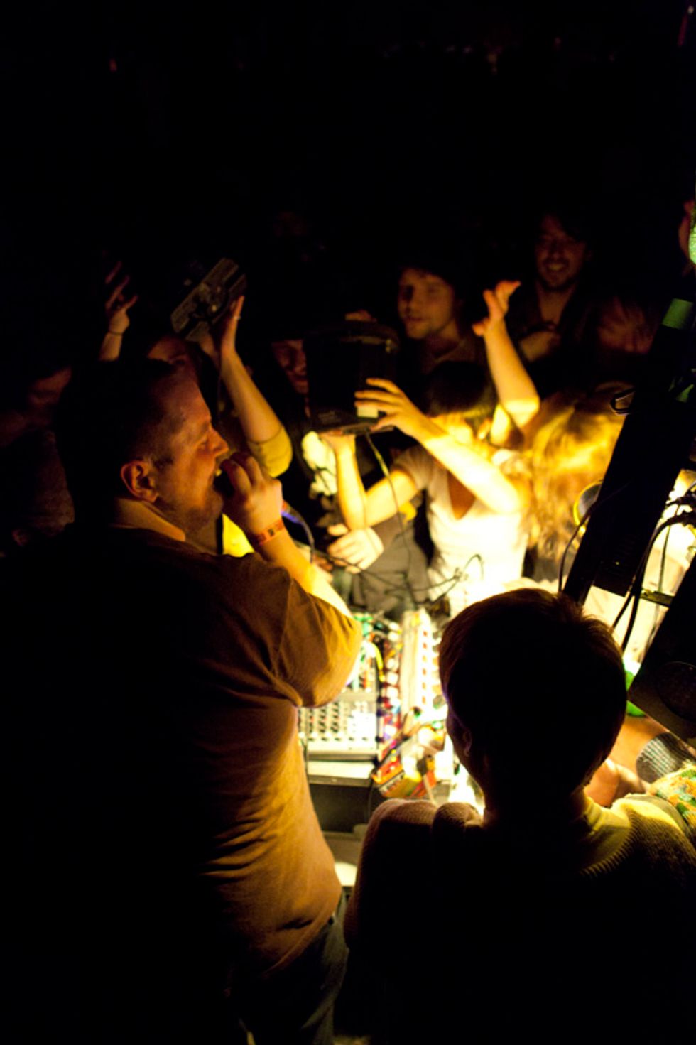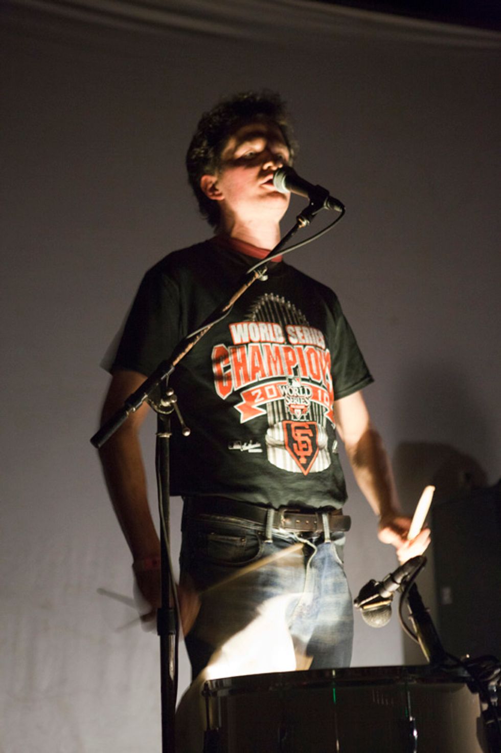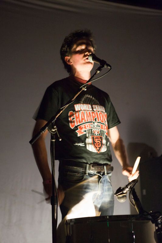 The man's songs are snippets of madness, slowly blooming from a few clipped notes and beats into towering walls of frenzied, kinetic, anthemic sound, adorned with twisted vocals and of course, brain hemmorhage-inducing strobe lights. Once songs like "Crystal Cat" or "Wham City Part 1 of 2" hit warp speed and you begin to feel airborne, the jam ends, leaving everyone on a sustained adrenaline rush, immune to and unconcerned with anything and everything happening outside of the Dan Deacon bubble. It's the delicate art of escapism on a Tuesday night. There was even a Francis Ford Coppola sighting.