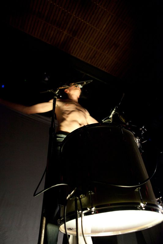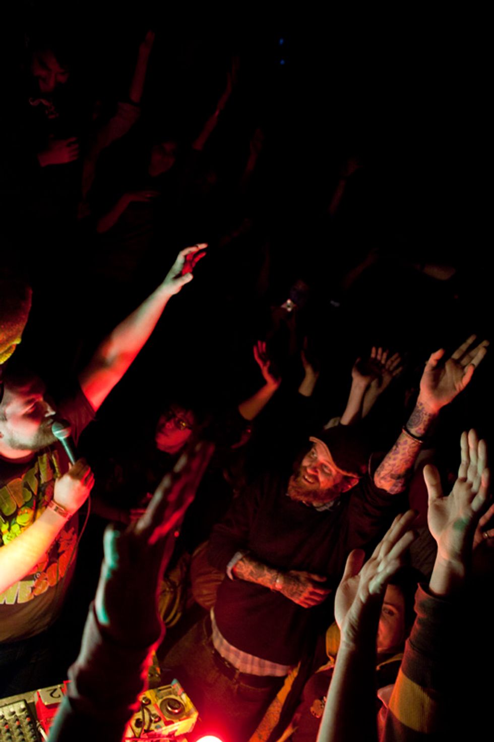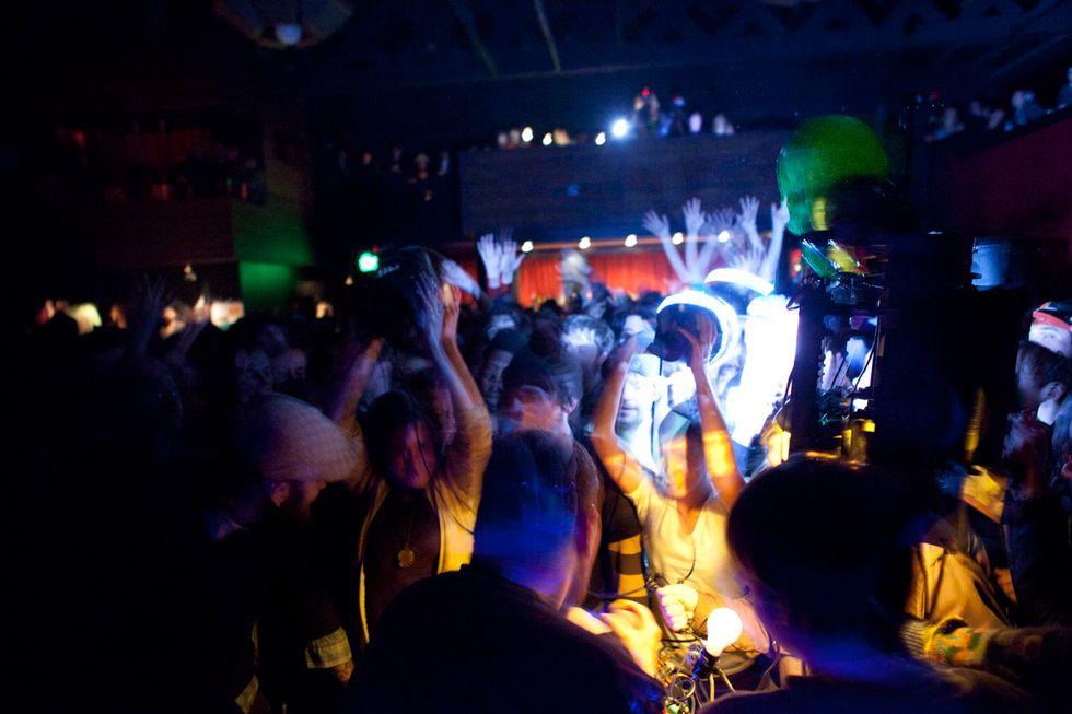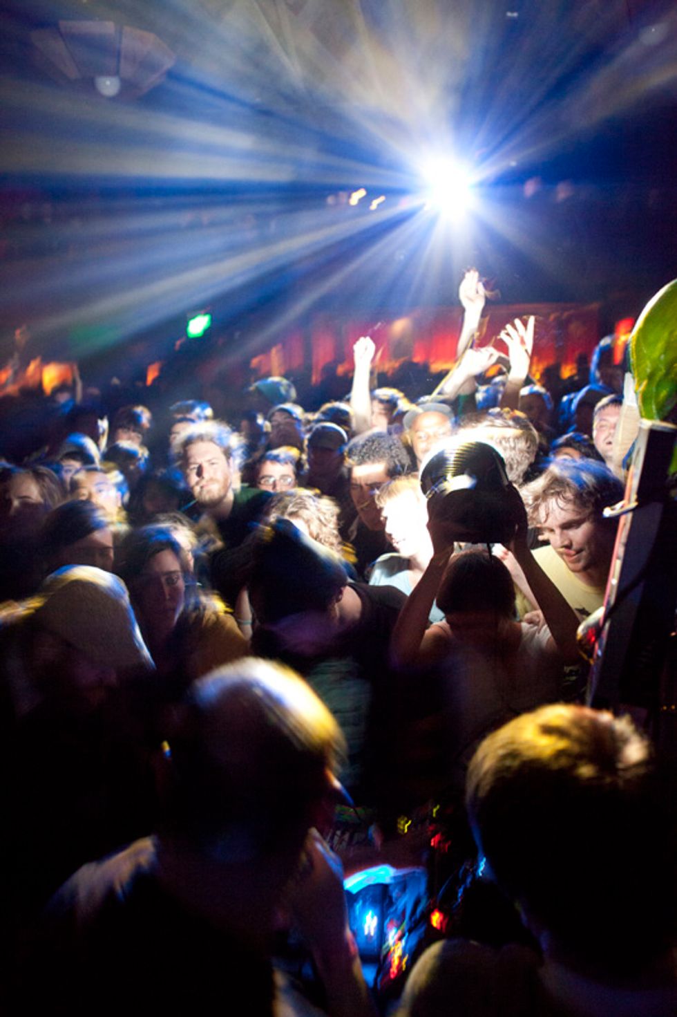 The man's songs are snippets of madness, slowly blooming from a few clipped notes and beats into towering walls of frenzied, kinetic, anthemic sound, adorned with twisted vocals and of course, brain hemmorhage-inducing strobe lights. Once songs like "Crystal Cat" or "Wham City Part 1 of 2" hit warp speed and you begin to feel airborne, the jam ends, leaving everyone on a sustained adrenaline rush, immune to and unconcerned with anything and everything happening outside of the Dan Deacon bubble. It's the delicate art of escapism on a Tuesday night. There was even a Francis Ford Coppola sighting.