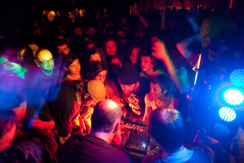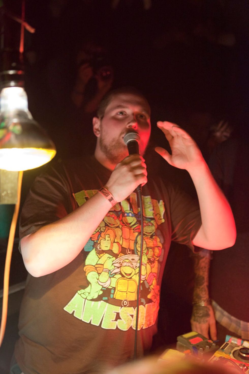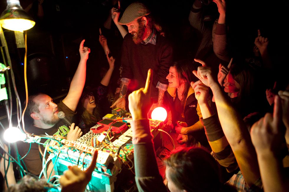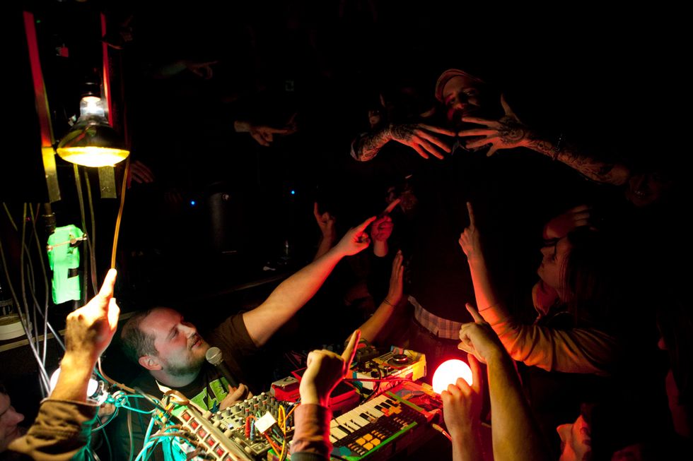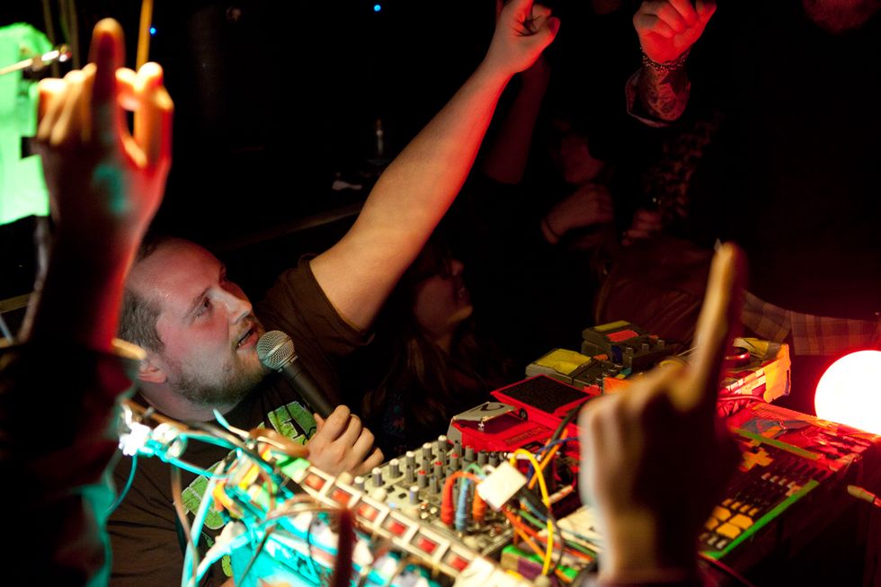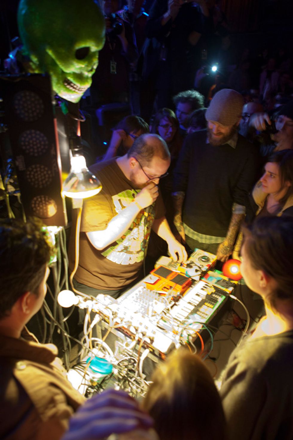 Dan Deacon is a tease. From his sound check to the music itself, the Baltimore-based analog wizard's first Noise Pop set was a glitchy glimpse into the restless mind of one of the best indie showmen travelling the country right now. Set up on the floor of the Independent, engulfed by eager fans' faces plastered with Cheshire Cat grins and testing his Vocoder and noodling on his equipment under the light of a glowing green skull, Deacon cracked jokes about Simon & Garfunkel tunes and braced the crowd (and himself) for his second show since Halloween.