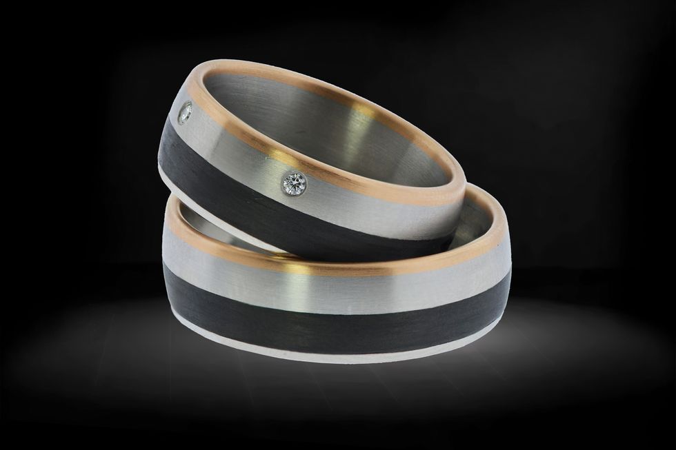 Palladium, 14k rose gold, carbon fiber and diamond, Starts at $1,600