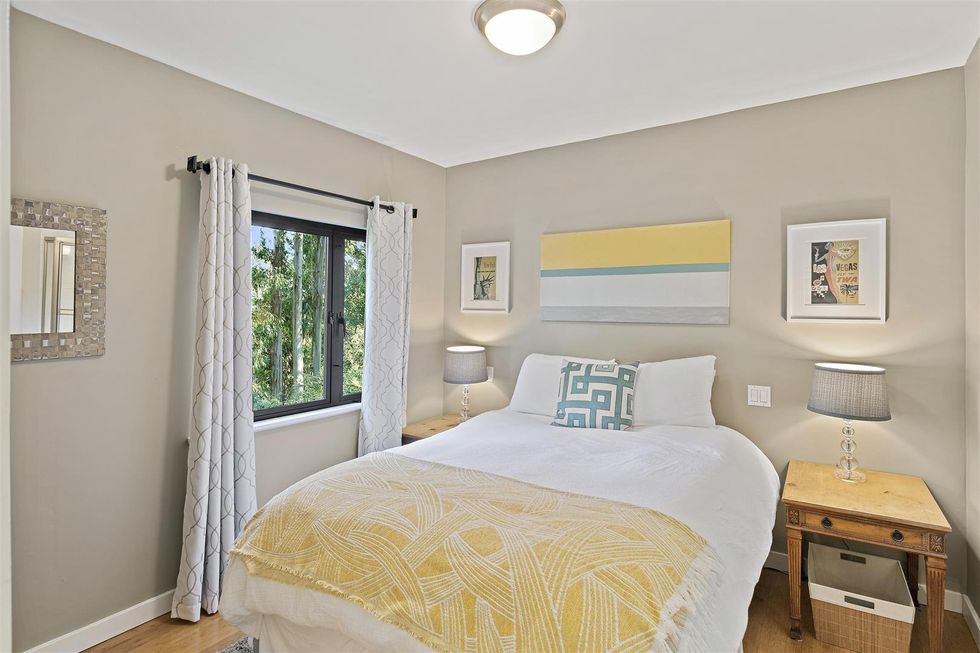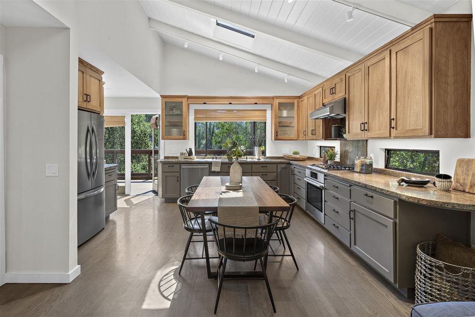 In the main residence, the remodeled eat-in kitchen has newer appliances, granite countertops, and custom-built Shaker-style ash wood cabinetry. French doors open from the kitchen to the large, sunny rear deck where you can relax and enjoy your morning coffee.