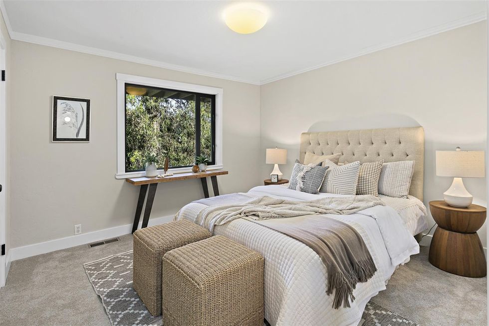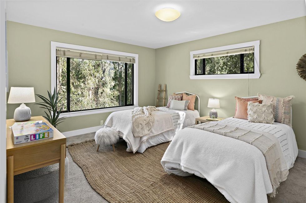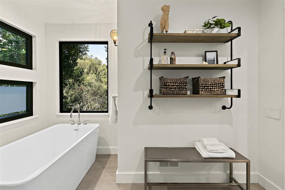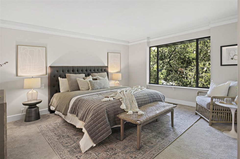 The spacious primary bedroom suite features a recently remodeled spa-like bathroom with custom-designed windows. This bathroom now has a large frameless glass shower with a temperature-controlled faucet and a deep soaking tub with a beautiful treetop view.