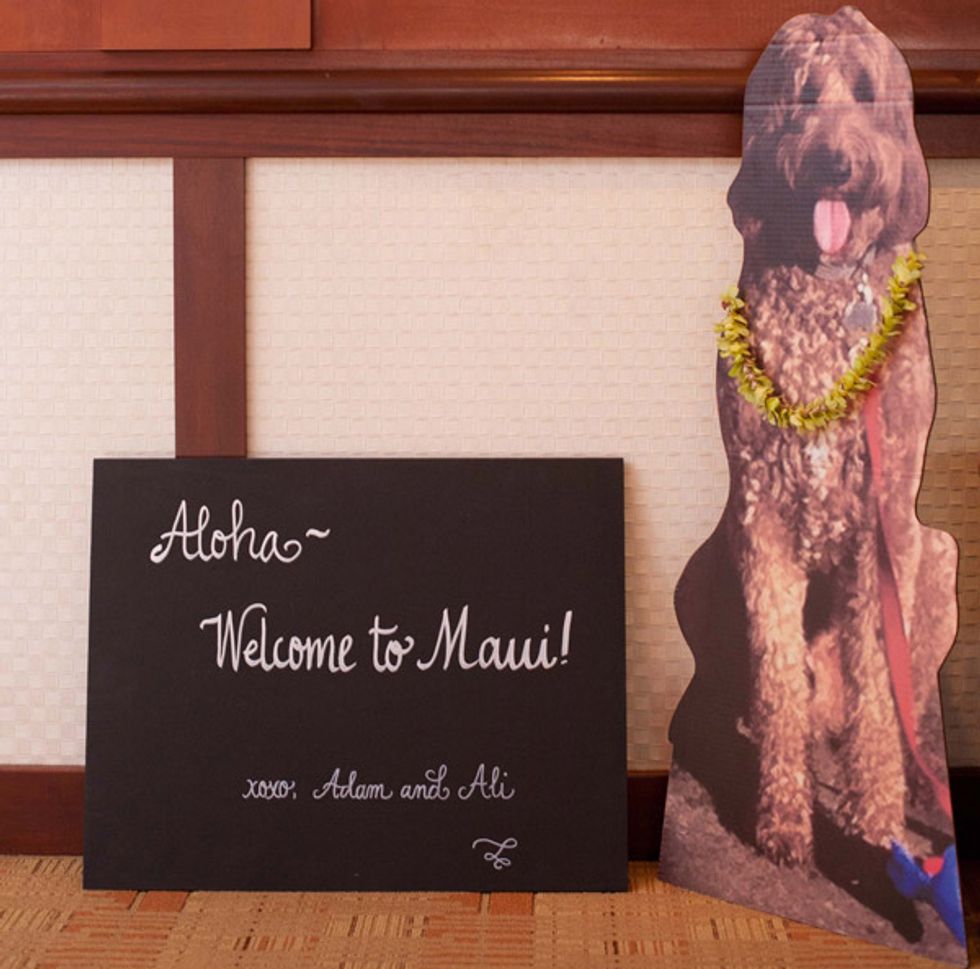 The weekend event began with a welcome party at Mala’s at the Wailea Marriott. Guests were greeted by a large cardboard cutout of Jack, the couple’s dog. “Jack is my four-year-old Labradoodle, he was a Christmas present from Adam,” says Ali. “He would have been quarantined if we flew him to Maui, so I got a cutout and brought it everywhere. It was a hit at the parties.”