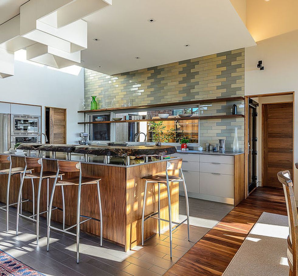 In the kitchen, a Heath tile backsplash wraps around a window just above the kitchen sink, which looks to one of the three courtyards. A 9-foot piece of burled redwood forms an L-shaped island bar top. All the interior wood cabinetry, flooring, door frames and doors are walnut.