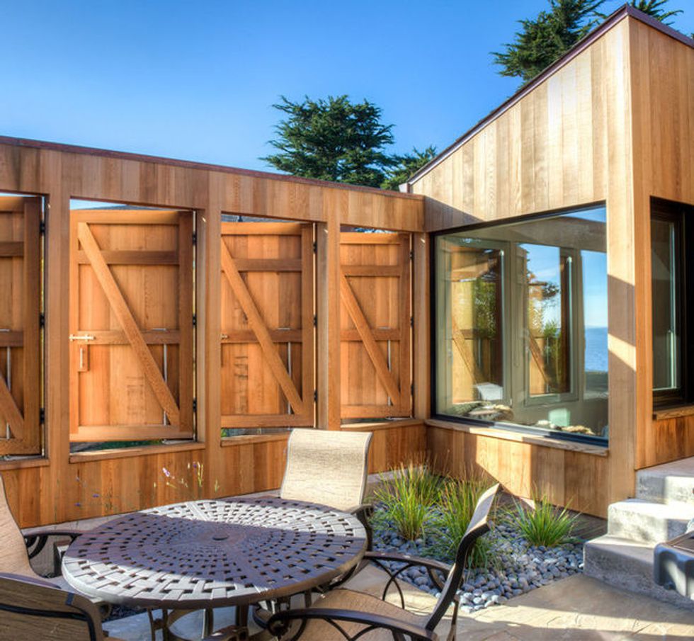 In the barbecue courtyard, innovative shutters pop out to varying degrees to offer views of the ocean while keeping the area private from neighbors.