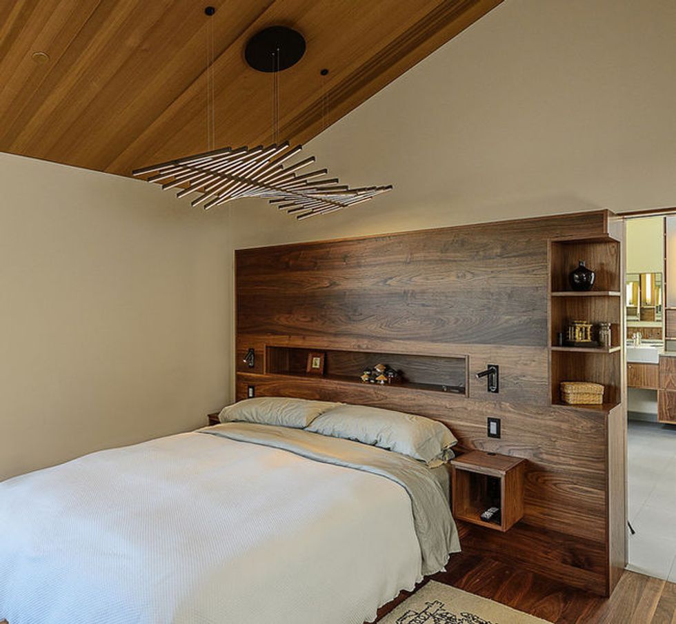 There are 32 voltaic panels on the roof that power all the electric components in the house. On sunny days the Agnews are able to generate enough power to send some back to the utility company for credit. Eric says calculations show that the house should be net zero, but they haven't lived in it long enough to be certain.Eric's daughter-in-law, Jeni Gamble, came up with the headboard design in the main bedroom. It, along with all the custom wood cabinet pieces in the home, was built locally by Jackson Hantzsche of Premier Glass and Cabinet.