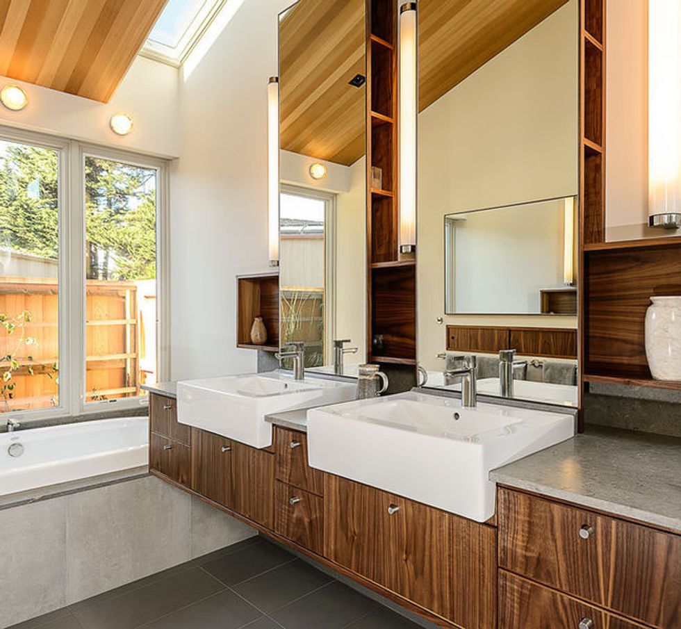 In the main bathroom, Heath tiles in the shower extend all the way to the 16-foot ceiling. Tall mirrors sit out from the wall, creating storage slots, one of Gamble's signature designs. The counter is limestone that contains small fossils. To complete the zen vibe, the window looks to a small garden.