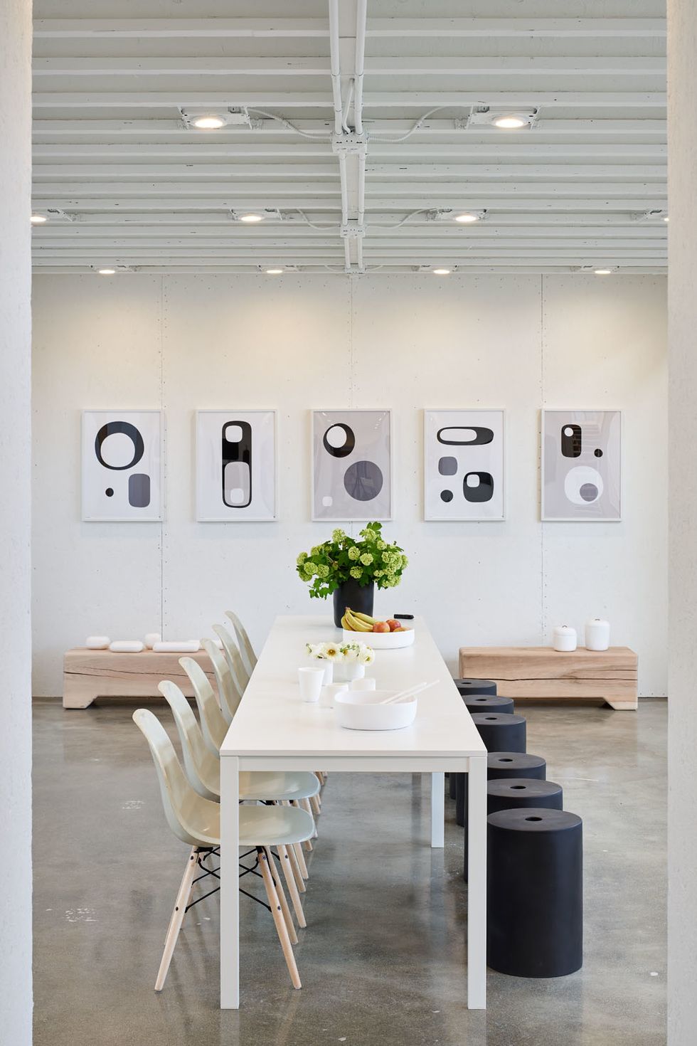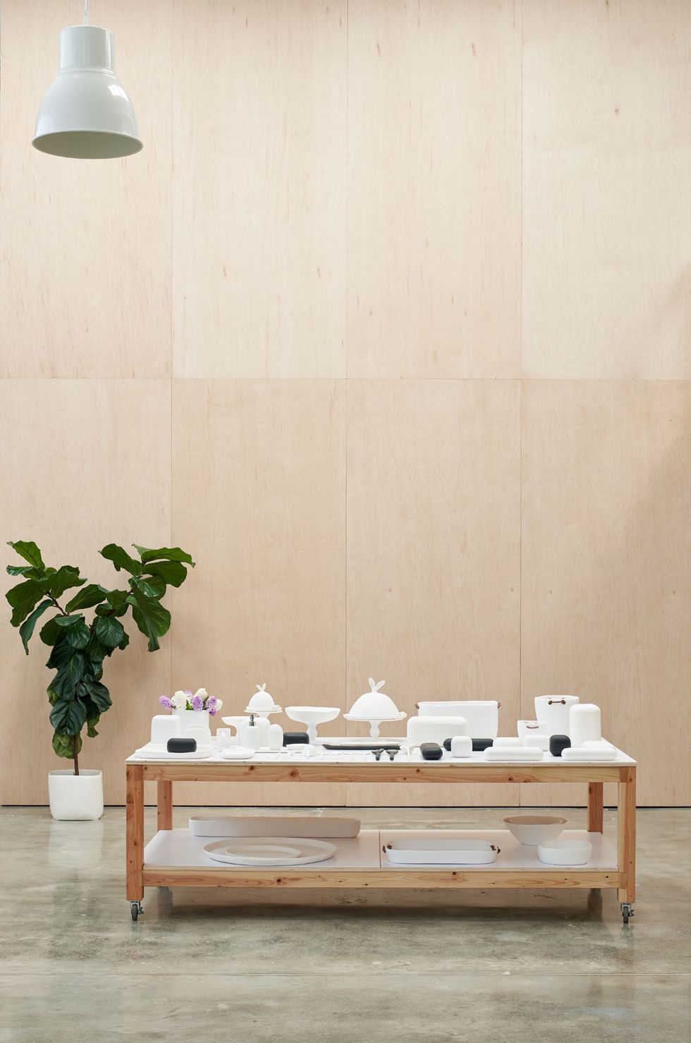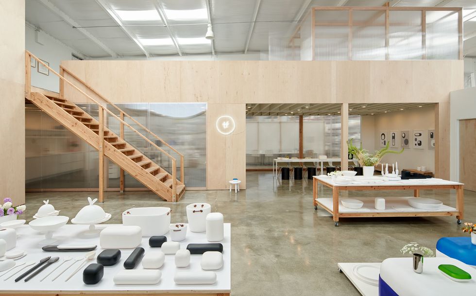 A longtime tenant of the Dogpatch's burgeoning creative community, Frey recently made the move further south into a Bayview warehouse that served as a blank canvas for her signature style. And since late 2017, she's been hard at work alongside SF architect George Bradley (best known for his contemporary residential work in the Bay Area) to transform the 7,500-square-foot building into a gallery-esque space that encapsulates the personality of her work, which is defined by clean but hand-finished lines and total nonchalance (think teardrop paperweights reminiscent of a dollop of whipped cream; letter openers shaped like slithering slugs; cake domes with rabbit ear handles; and bon bon boxes in the shape of Igloo coolers).