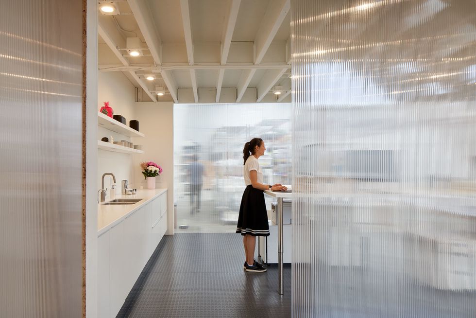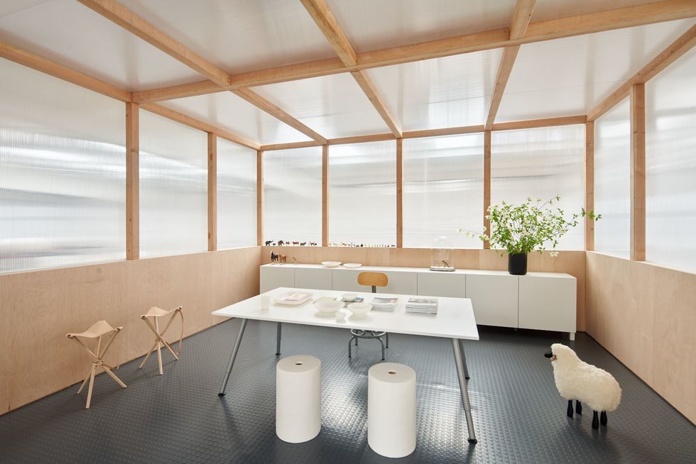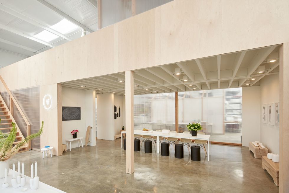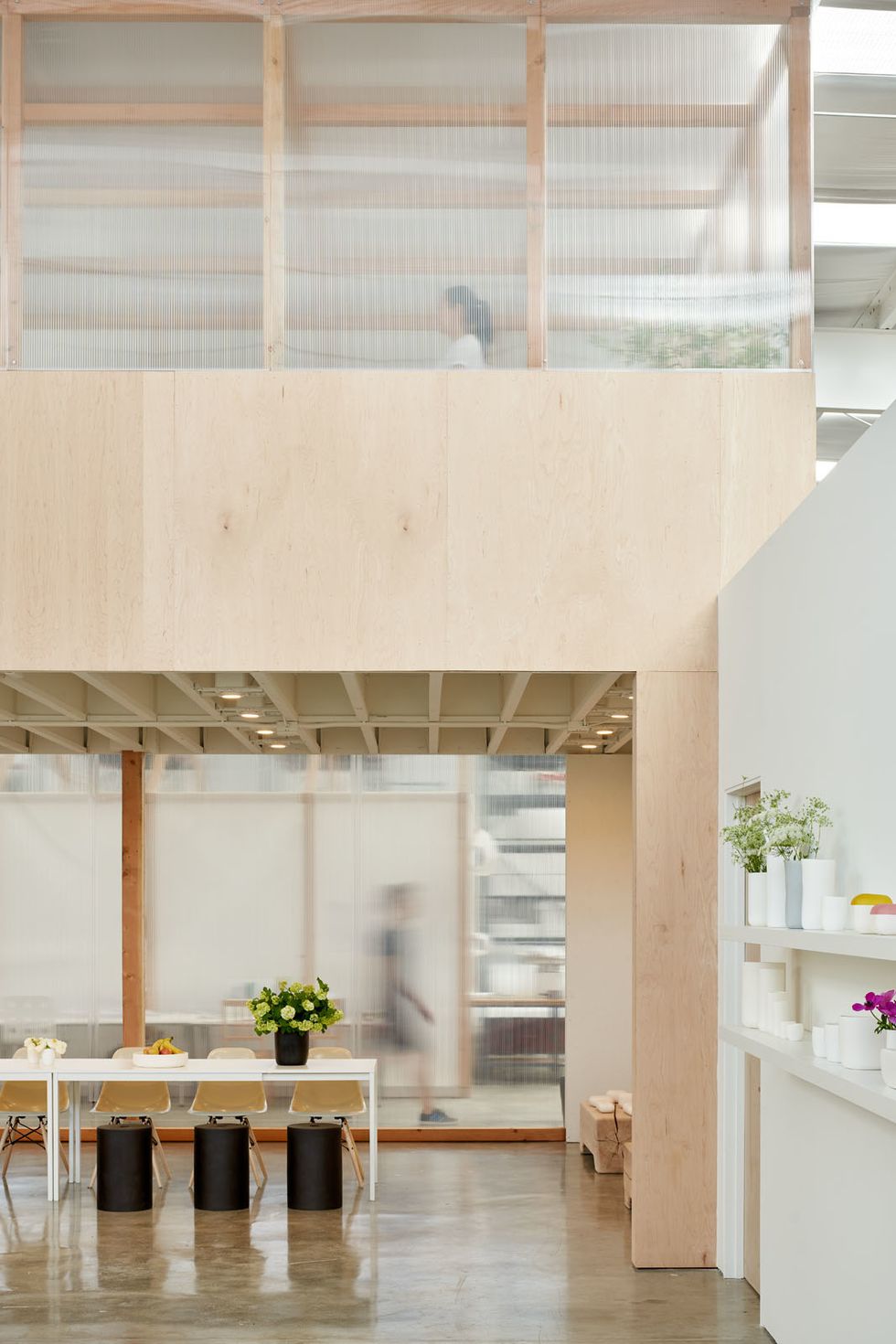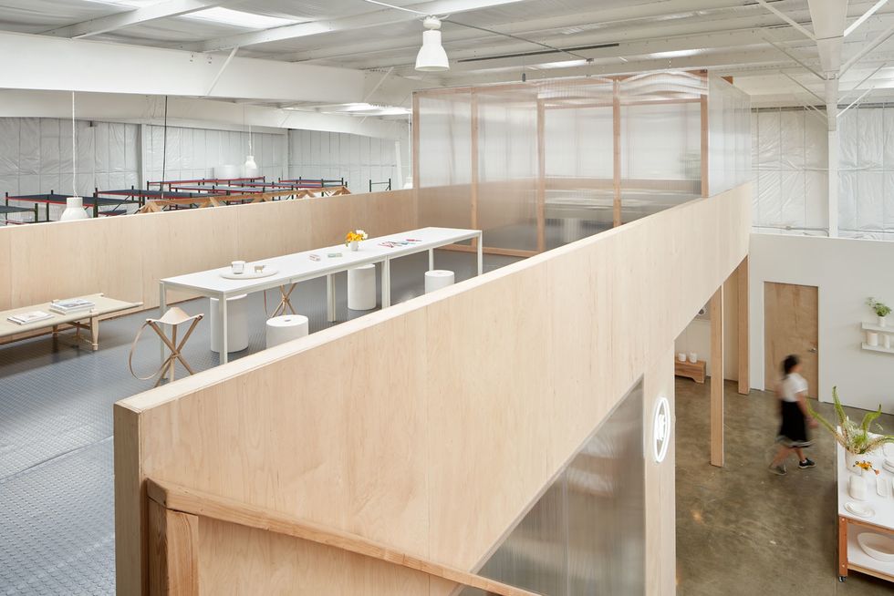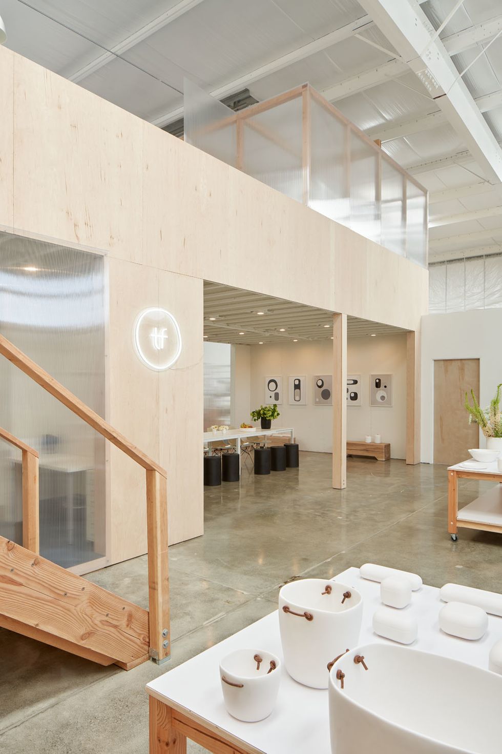 The place has energy from first approach, where you can't help but be stopped by the corrugated metal façade done in a super-chic midnight hue; a horizontal band of lights warms the building's entrance. Inside you'll be met with the sleek, airy palette such a first impression suggests: white walls and neutral wood furnishings contrasted by pops of color; artful florals and subtle greenery; skylights to flood the space with natural light, and translucent polycarbonate panels designed to capture and refract those luminous rays (while also separating the retail space at front from the shipping area at back). Just a few well edited geometric shapes and playful elements—a fuzzy sheep and a skateboard—keep things from going stark. Marie Kondo would be proud.