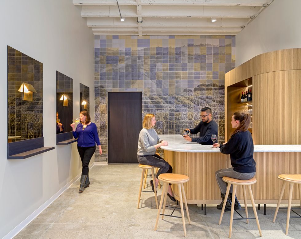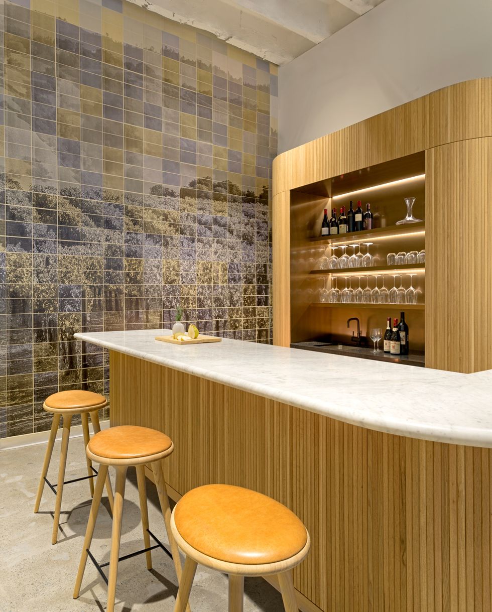 Whether you're a staffer coming to work at Vinfolio or headed in for a meeting with CEO Don St. Pierre, Jr., you'll make a grand entrance through an oversized, ebony-stained door that opens to a bar and tasting room with high ceilings and large factory-framed steel windows. Just what we'd want to see as we arrive at the office in the morning, the wraparound bar is clad in paper-packed oak tambour (more commonly seen on roll-top bread boxes) with marble countertops and leather-topped stools. The backdrop? A mosaic-style image of our beloved Napa Valley, composed of squares that have been printed, cut, and wheat-pasted to the wall.