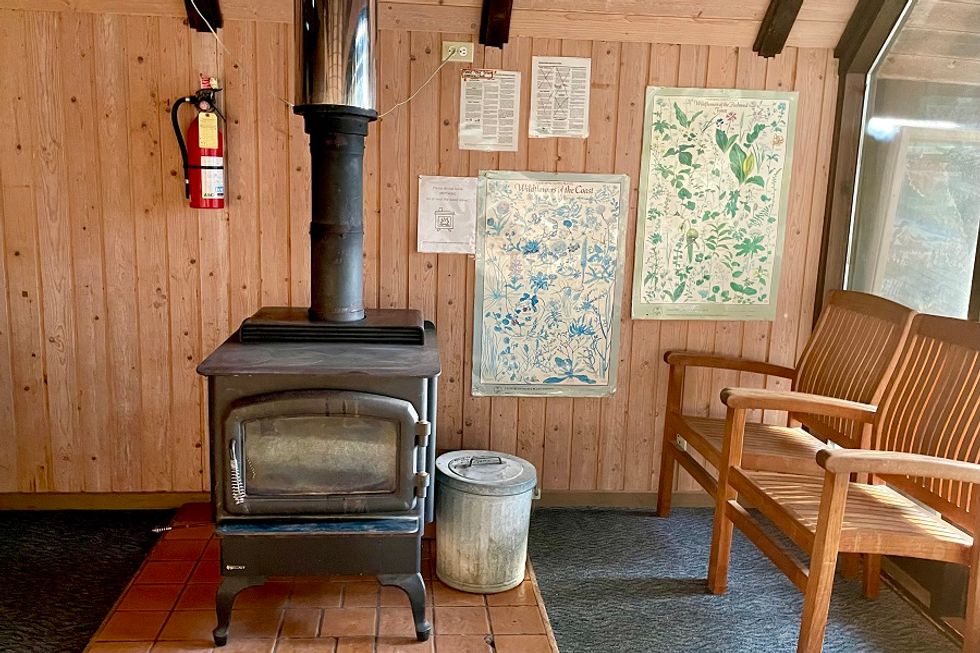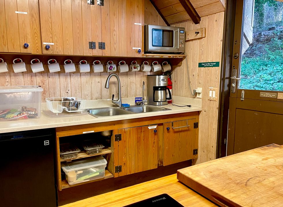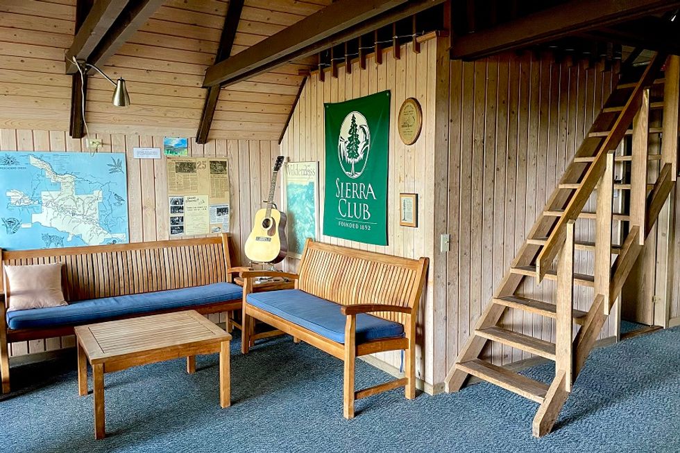 In the main room, a plastic tablecloth is draped over a long wooden table with eight chairs, and three cushioned benches form a little lounge around a coffee table. Posters with drawings of local plants and a Sierra Club pennant hang on the walls. There’s a bathroom with a toilet and sink indoors, but they request that you only use that one late-night; there are three other flushing bathrooms on the deck outside.