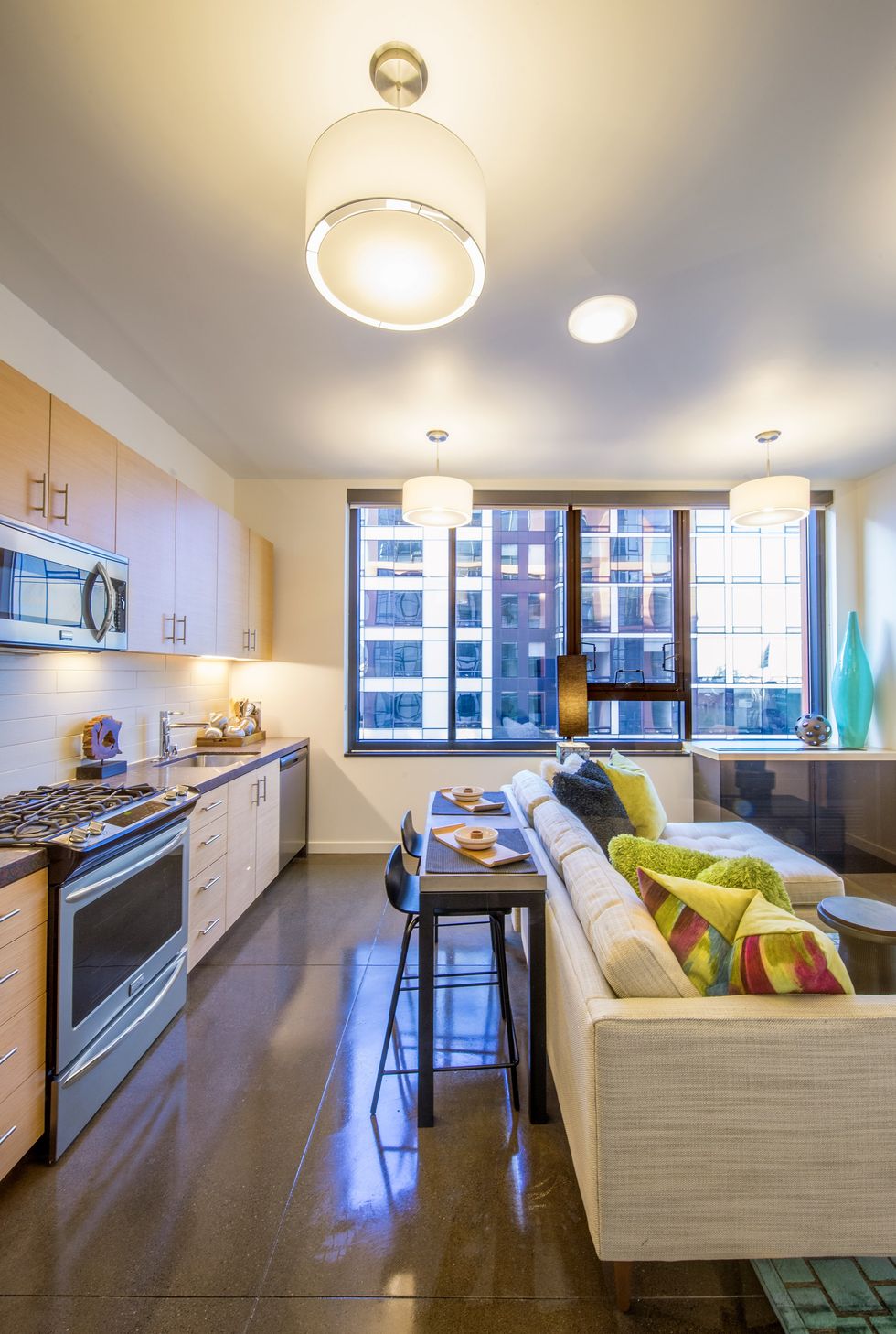 Olume's stylish and spacious apartments (available in studio, 1 bedroom, and 2 bedrooms) are perfect for on-the-go minimalists. Each apartment is expertly designed to make you feel comfortable at home, with stunning interior finishes such as oversized birch wood doors, stainless steel hardware, and quartz countertops.