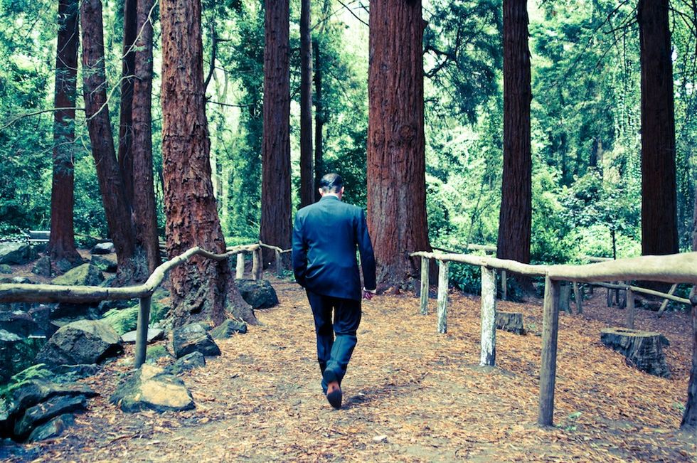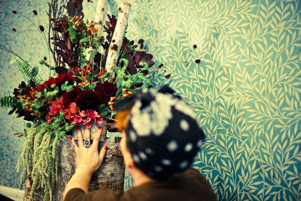 Floral designer Michele Quain worked with the bride to set the mood for the enchanted woodland theme, which carried from the redwood grove to the historic Trocadero Clubhouse, originally a hotel built in 1892. DIY handmade mason jar terrariums filled with fresh moss, acorns, nests, feathers, twigs, toadstools, birds, ladybugs, and pinecones were centerpieces. The tables were sprinkled with subtle votive candles and flower arrangements in tones of deep, dark red & vibrant jewel-toned pink: Dahlias, hydrangea, anemones, chocolate cosmos, spray roses, scabiosa flowers and pods, hypericum berry, helaboris, mint, chamomile, scented geranium and blackberry branches.